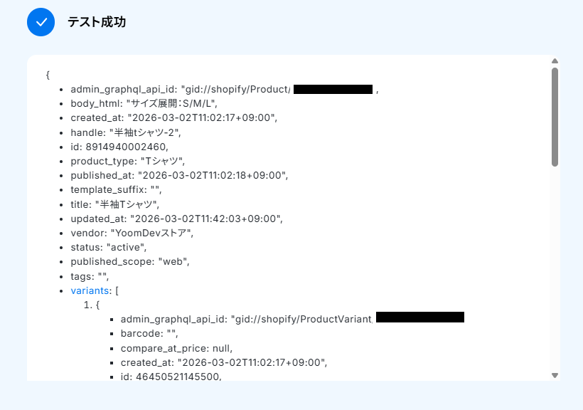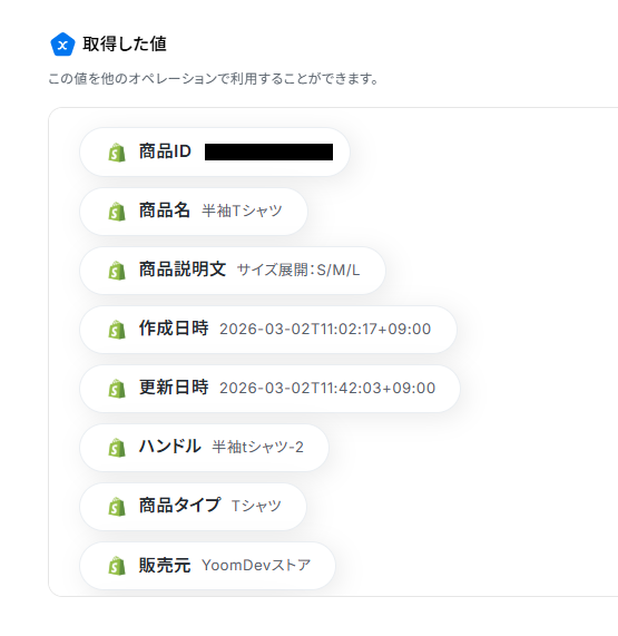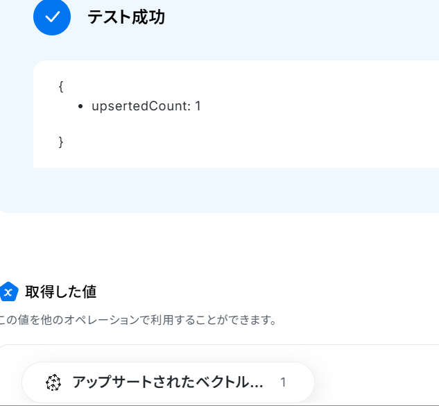 Yoomの画面に戻ってテストを実行してください。 テストが成功すると取得した値が表示されるので、内容を確認しましょう。 ※取得した値 とは、トリガーやオペレーションの設定時に「テスト」を実行して取得した値を指します。 これらは後続のオペレーション設定時の入力値として利用でき、フローボットを起動するたびに内容が変動します。テストの重要性:「取得した値」のテスト値について