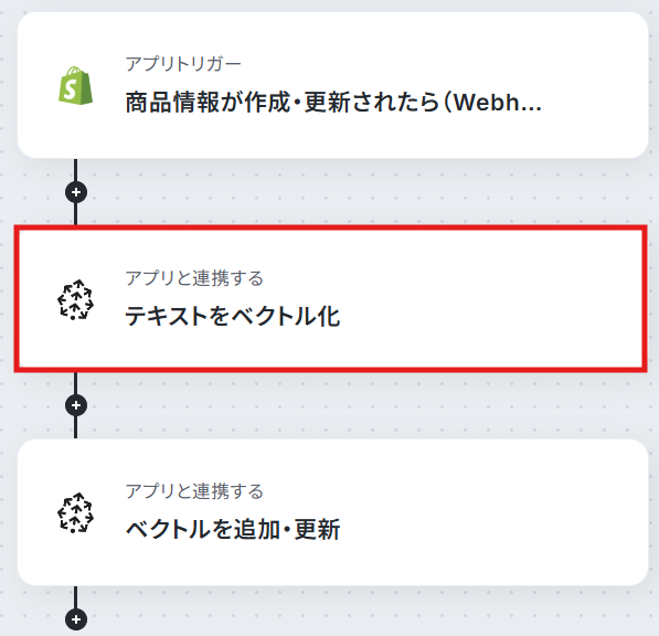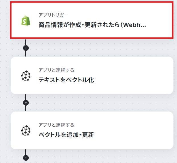はじめに、ShopifyとPineconeをYoomと連携します。 次に、トリガーでShopifyを選択し、「商品情報が作成・更新されたら」というアクションを設定します。 次に、オペレーションでPineconeの「テキストをベクトル化」アクションを設定し、Shopifyの商品情報からベクトル化したいテキスト情報を指定します。 最後に、オペレーションでPineconeの「ベクトルを追加・更新」アクションを設定し、前のステップで生成したベクトルデータをインデックスに追加・更新します。 ※「トリガー」:フロー起動のきっかけとなるアクション、「オペレーション」:トリガー起動後、フロー内で処理を行うアクション■このワークフローのカスタムポイント