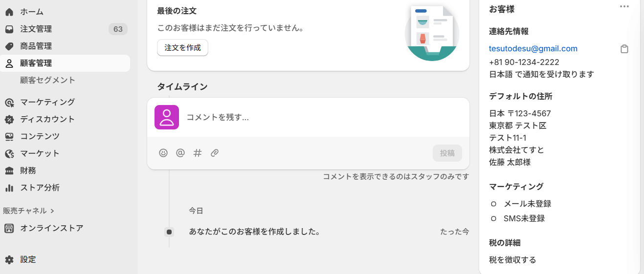 続いて、Webhookの動作テストを行うため、新規の顧客情報を追加します。