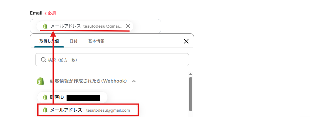 このように設定することでShopifyに新たに登録された顧客情報の「メールアドレス」を自動で反映することが可能です。