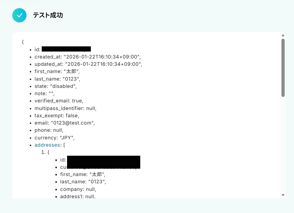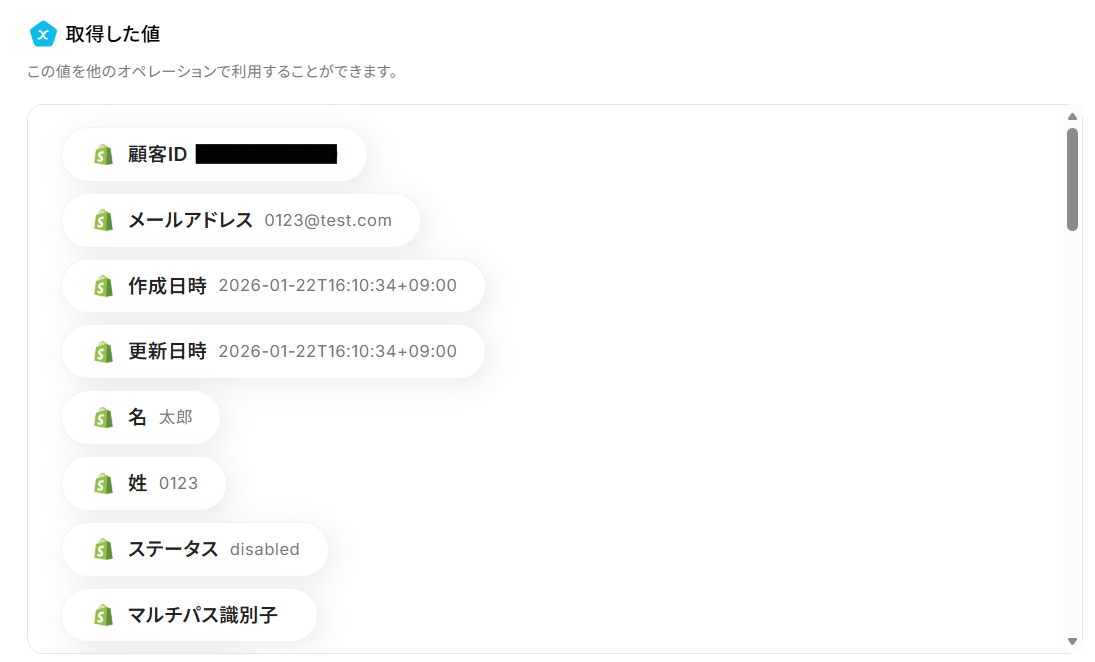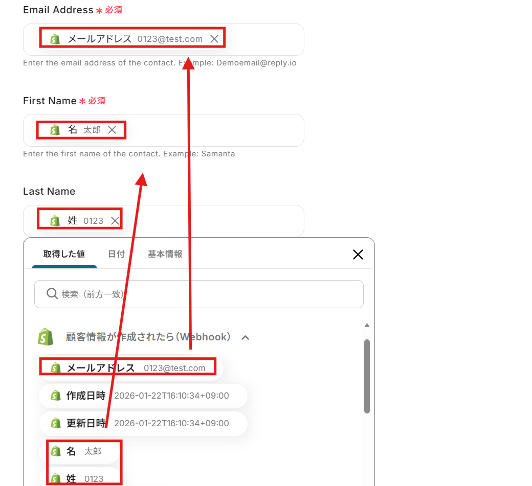 各項目にShopifyの顧客情報を、取得した値からマッピングしてください。