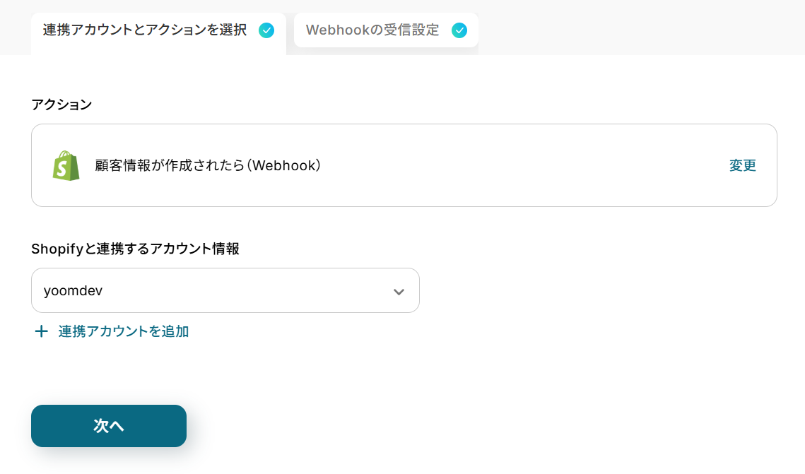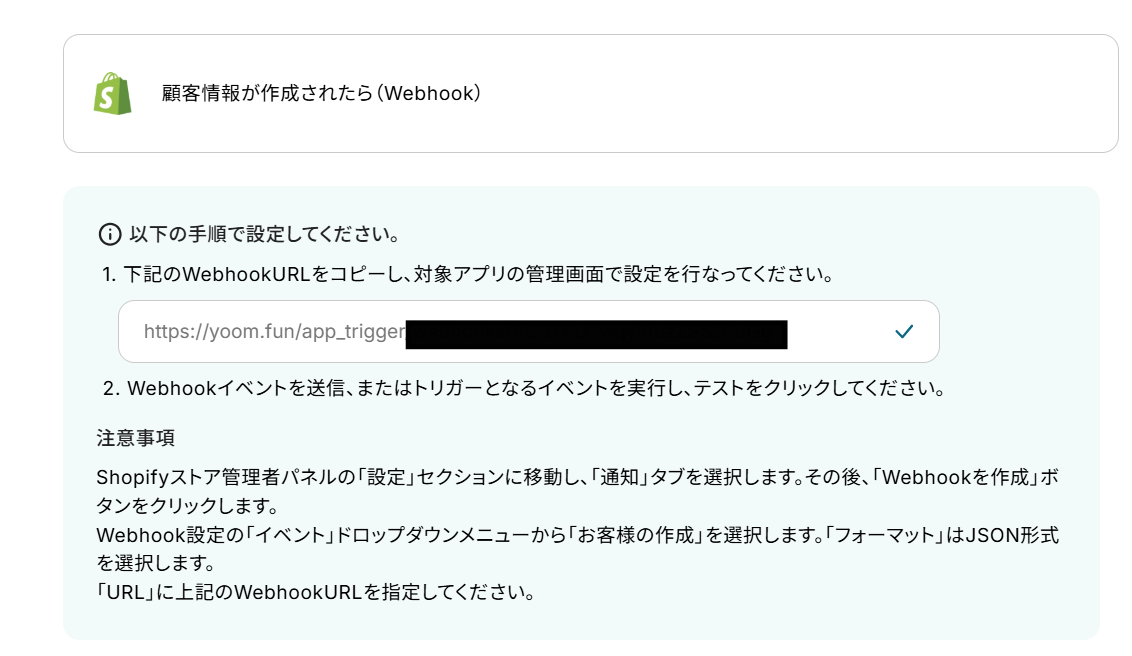 - 次に、トリガーでShopifyを選択し、「顧客情報が作成されたら(Webhook)」を設定します