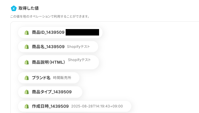 設定ができたら「テスト」をクリックし、実際にShopifyから取得した値が表示されているか確認しましょう。