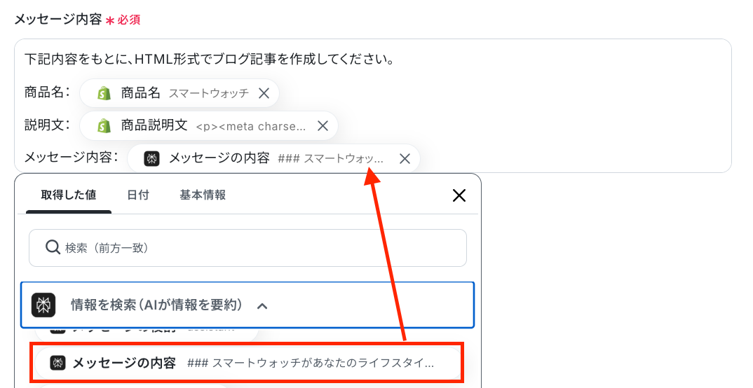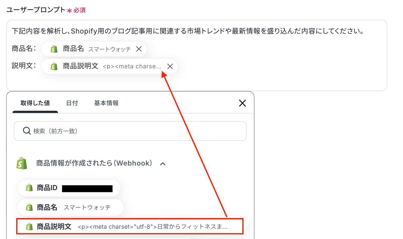 - 「ユーザープロンプト」には、Shopifyのオペレーションで取得した値を引用して設定しましょう!