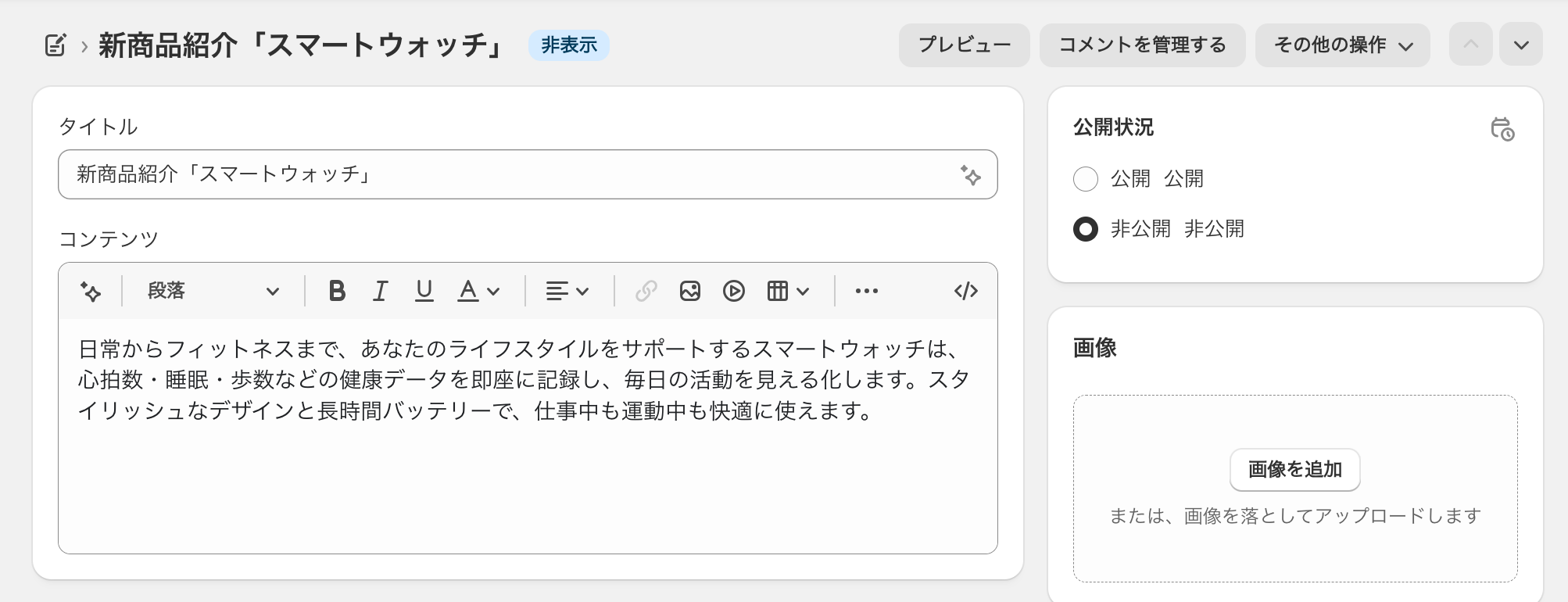 生成した記事は、Shopifyでの公開設定を「非公開」にすることで、下書きとして保存できます。