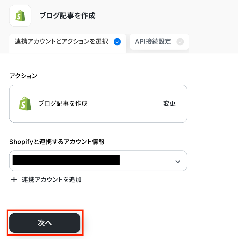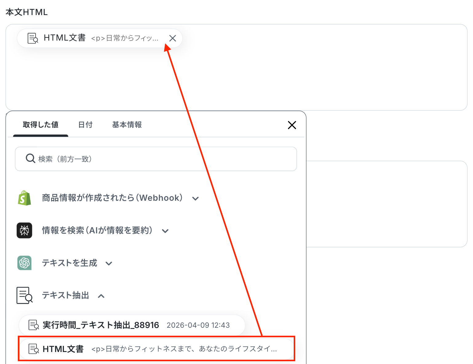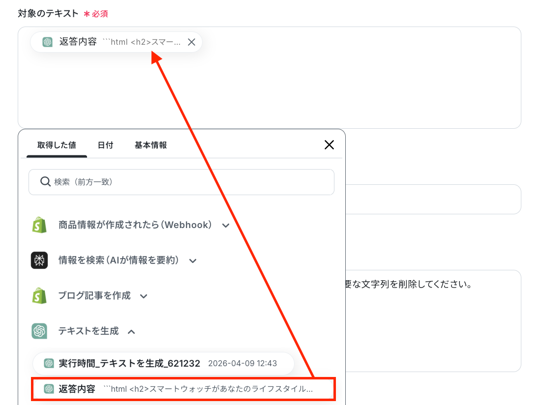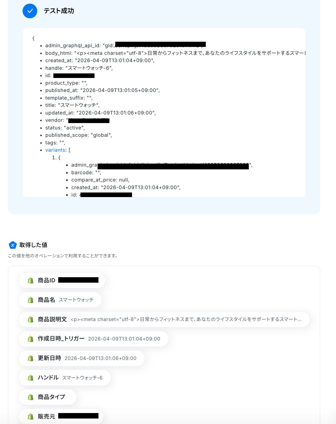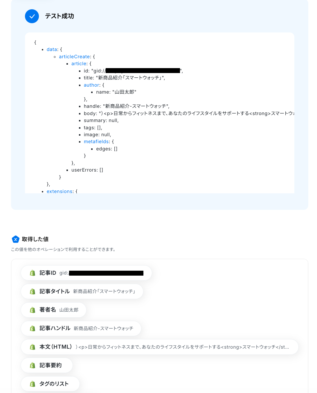 - 最後に、オペレーションでShopifyの「ブログ記事を作成」を設定し、抽出した内容でShopifyにブログ記事を投稿します