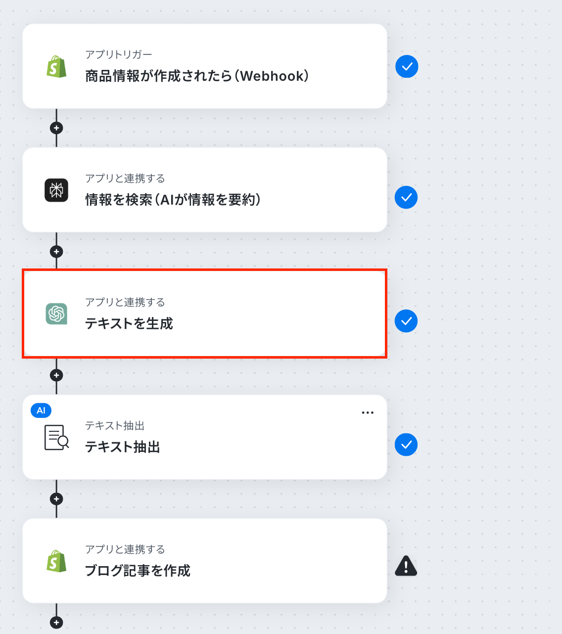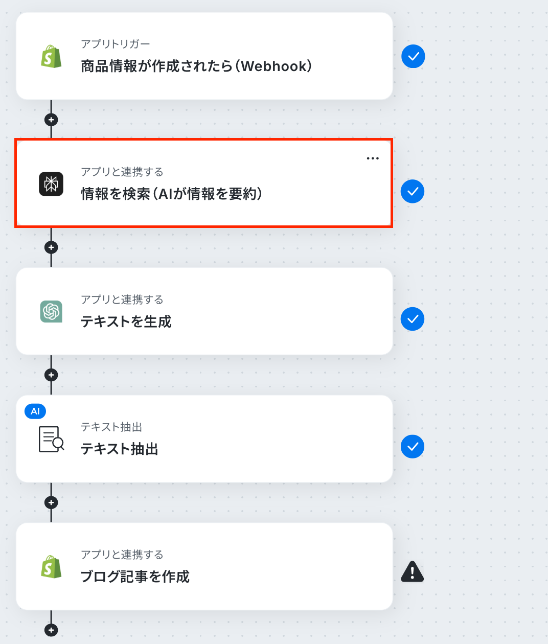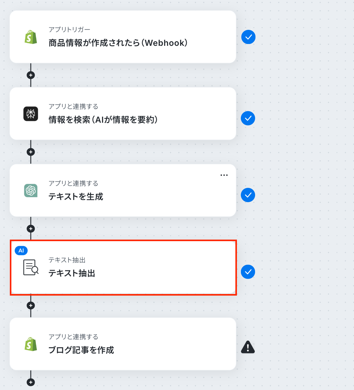 - Shopifyのトリガー・テキスト抽出・Perplexity・ChatGPT・Shopifyのアクション設定