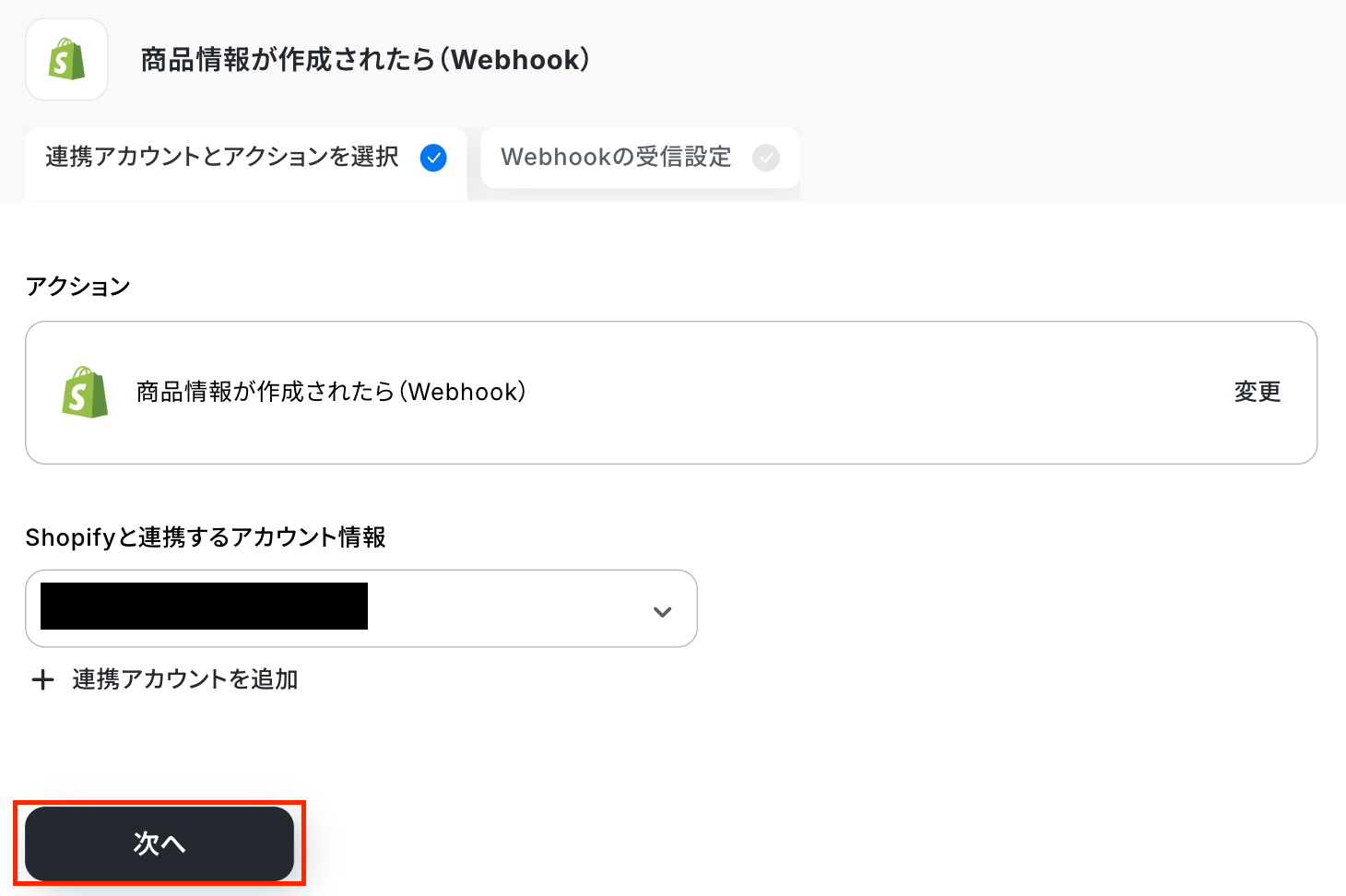 - 次に、トリガーでShopifyを選択し、「商品情報が作成されたら」というアクションを設定します