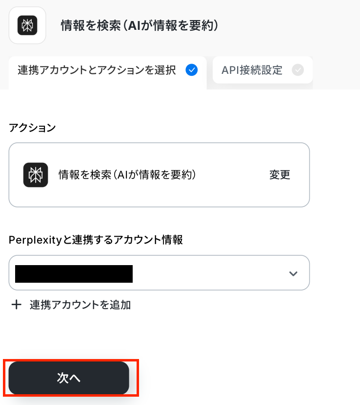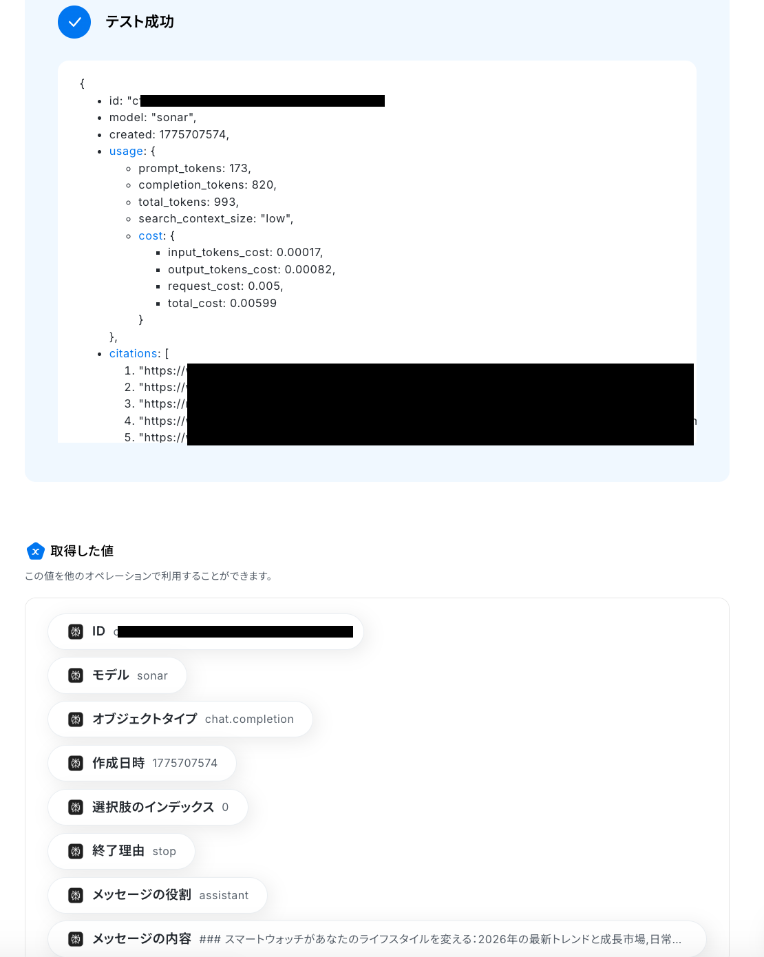 - Perplexityのテキスト生成アクションでは、使用するモデル名や、より精度の高い情報を得るためのプロンプトを任意で設定することが可能です