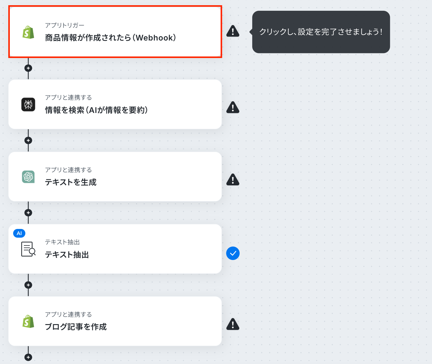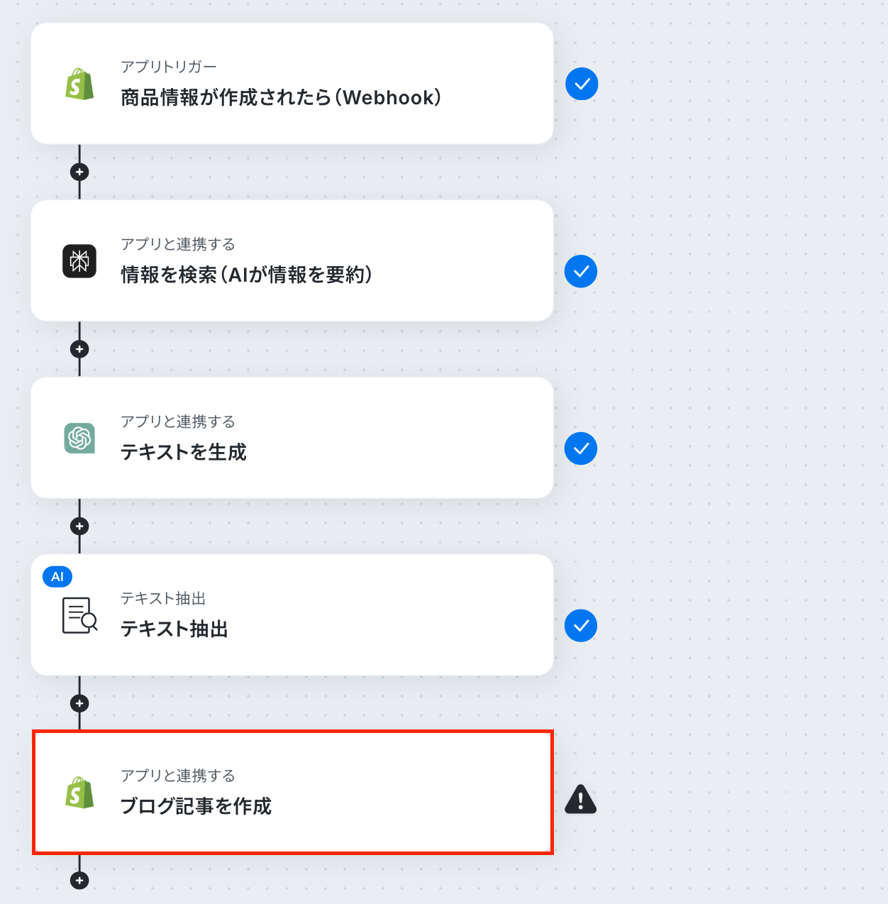ここから「Shopifyで商品が作成されたら、Perplexityで市場のトレンドを調査しブログ記事を作成する」フローの設定をしていきます。