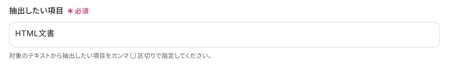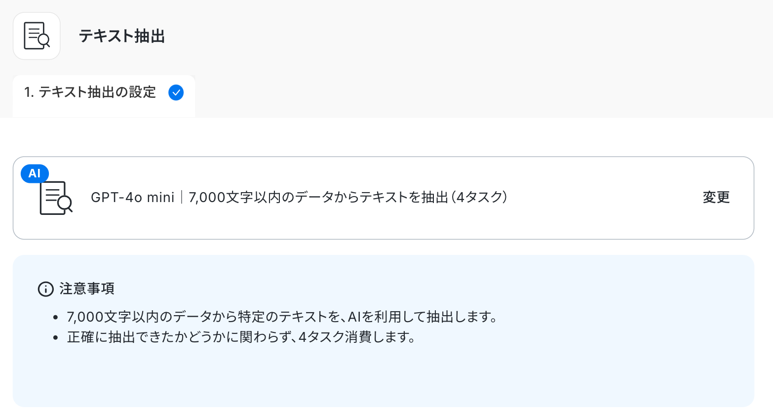 - AI機能のテキスト抽出では、トリガーで取得した情報の中から、抽出したいテキスト項目を任意で設定できます