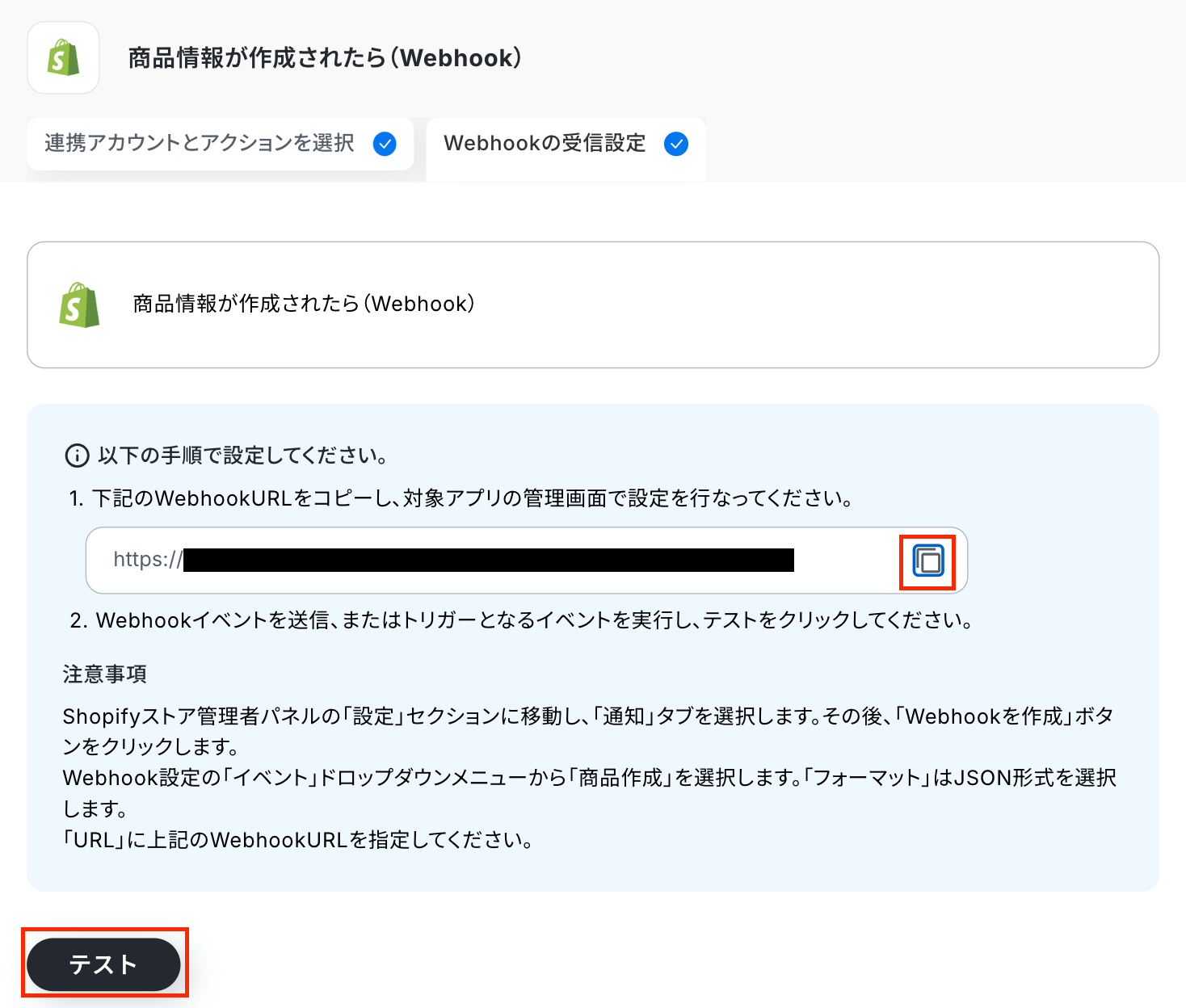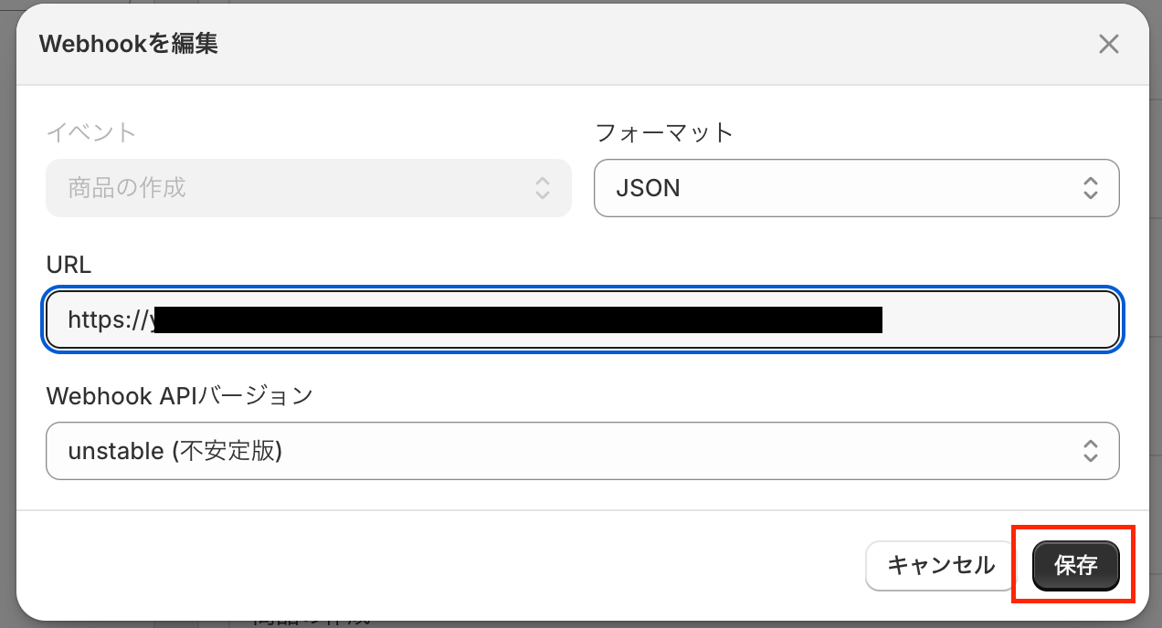 ShopifyのWebhook管理画面に移動したら、設定を行います。