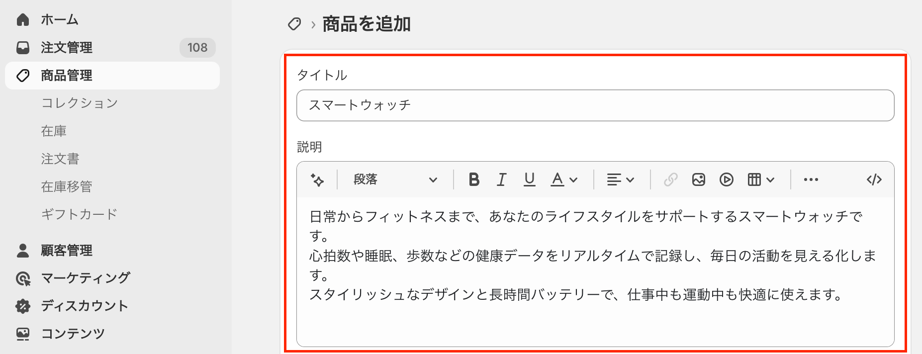 続いて、動作チェックのため、Shopifyで実際に商品を作成しましょう。