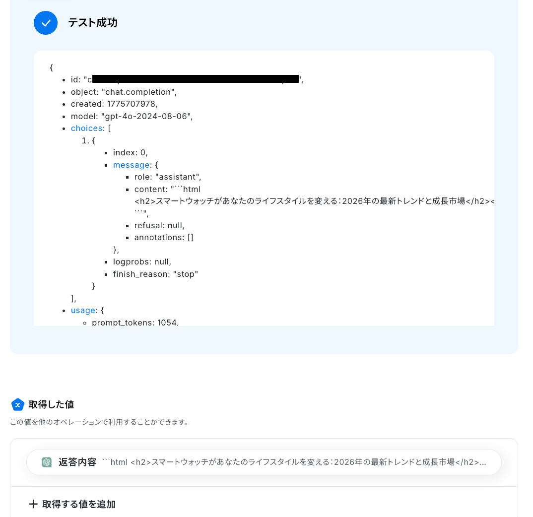 - 次に、オペレーションでChatGPTの「テキストを生成」を設定し、Perplexityの検索結果を参考にしてブログ記事の原稿を作成します