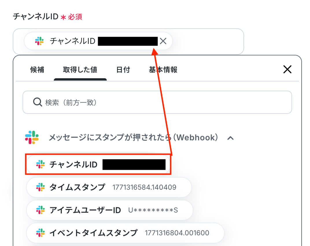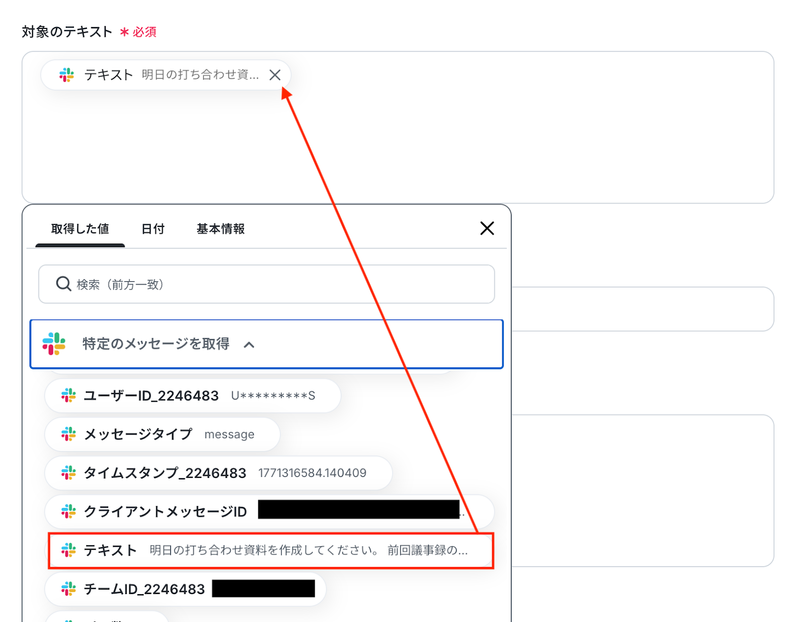 入力欄をクリックすると、前のステップでSlackから取得した値が表示されるので、選択して入力しましょう。