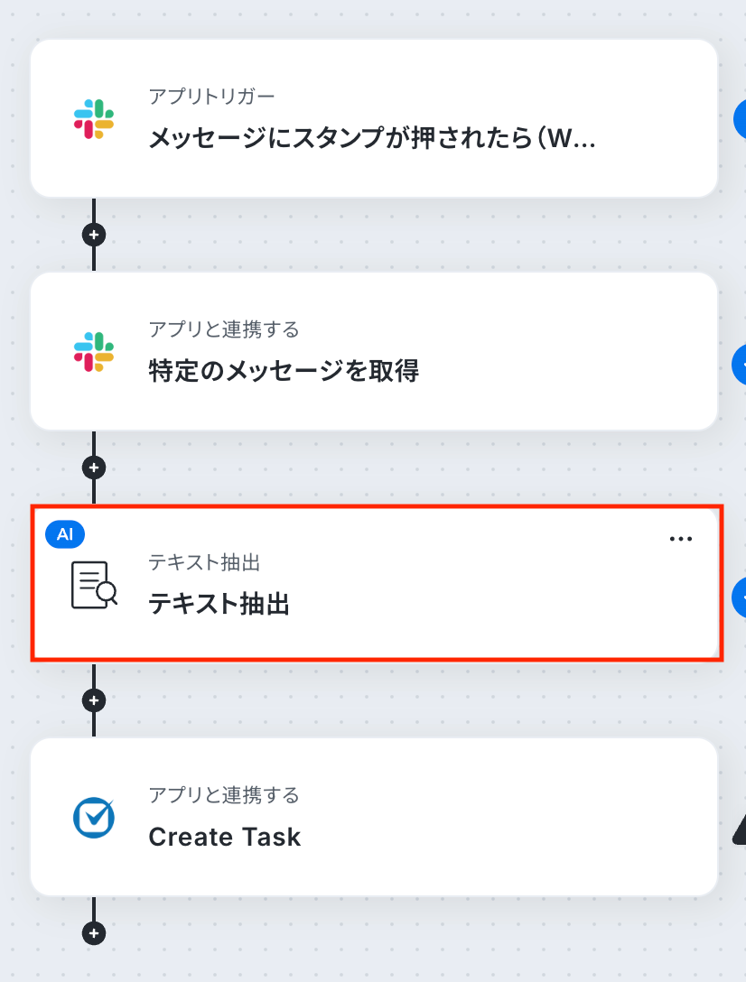 前のステップでSlackから取得した特定メッセージを対象に、AIでテキストを抽出します。