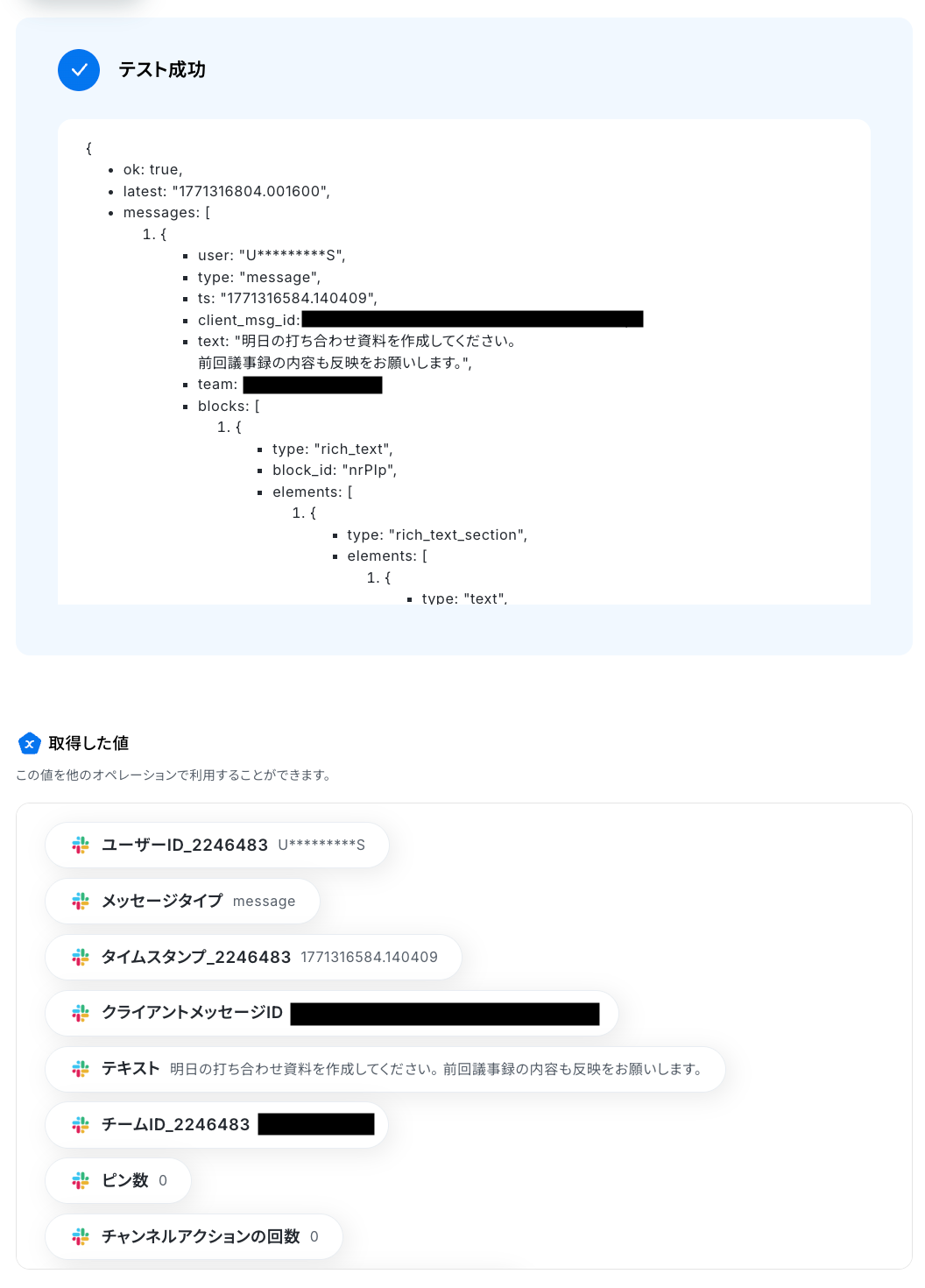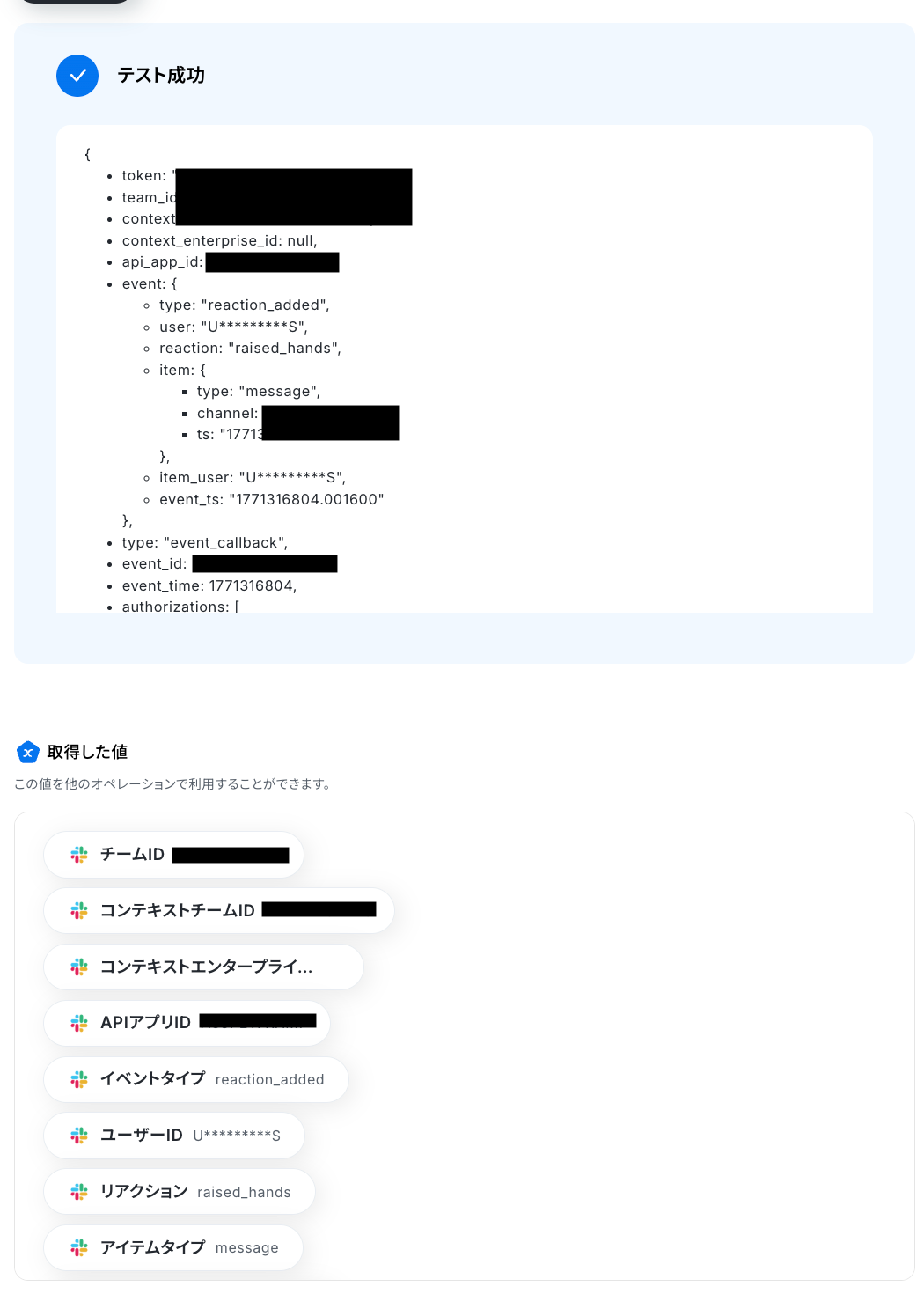 テストに成功すると、Slackでスタンプが押されたメッセージに関する情報が表示されます。 以下の取得した値はこの後のステップで利用できます。