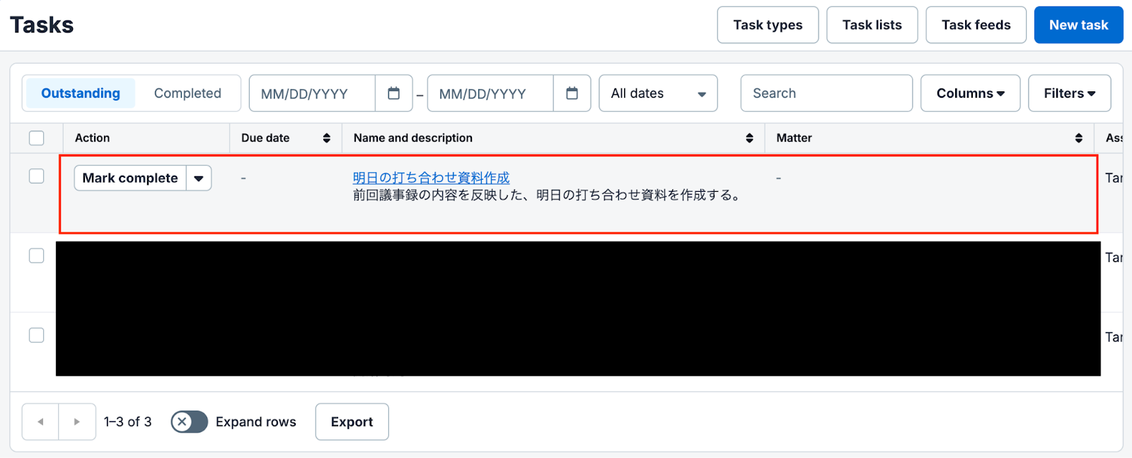 テストが成功したらClio Manageの画面を開き、実際にタスクが作成されているかを確認してみましょう。 今回は下記のとおり作成されていました!