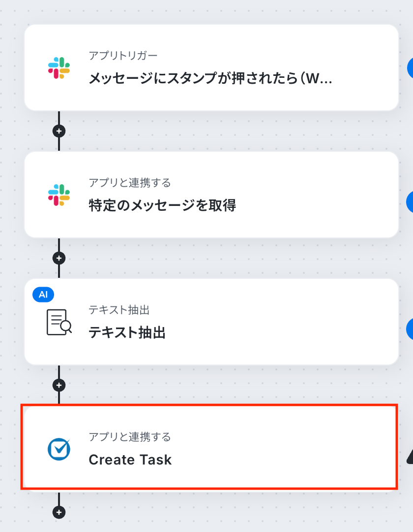 ステップ5:AI機能でテキスト抽出 続いて、前のステップでSlackから取得した値を利用して、Clio Manageのタスク作成に必要なテキストを抽出する設定を行いましょう。