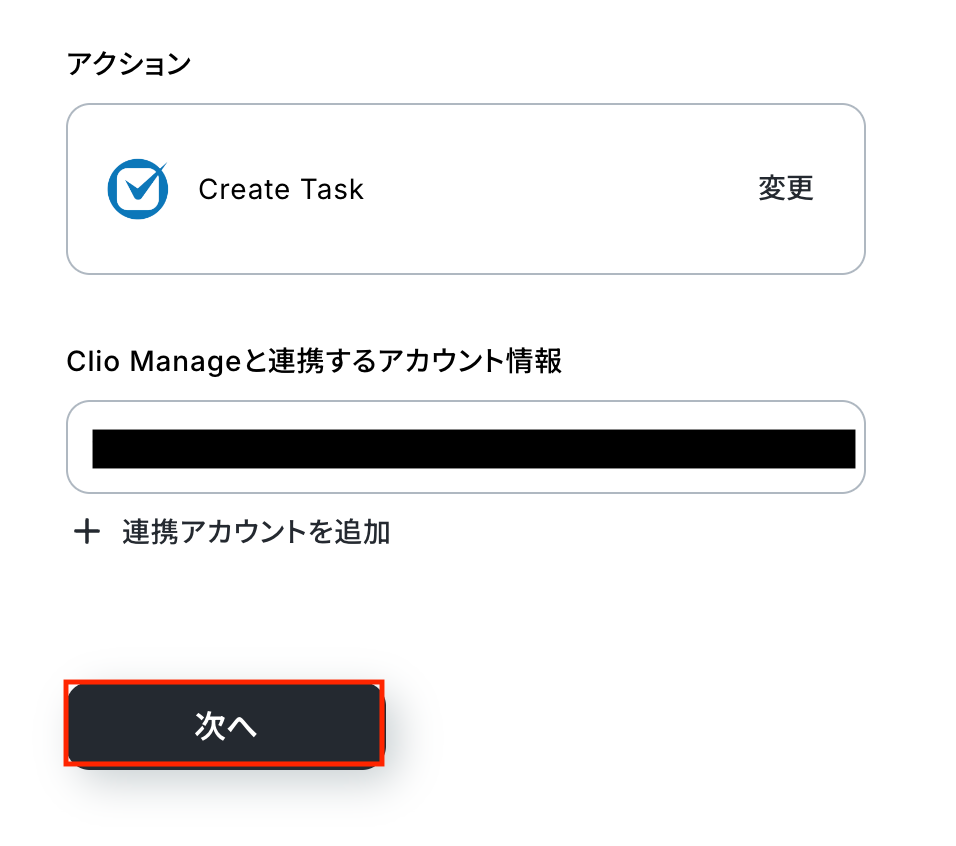 アクションはあらかじめ設定されているため、そのまま内容を確認してください。 Clio Manageと連携するアカウント情報に問題がなければ、「次へ」をクリックします。