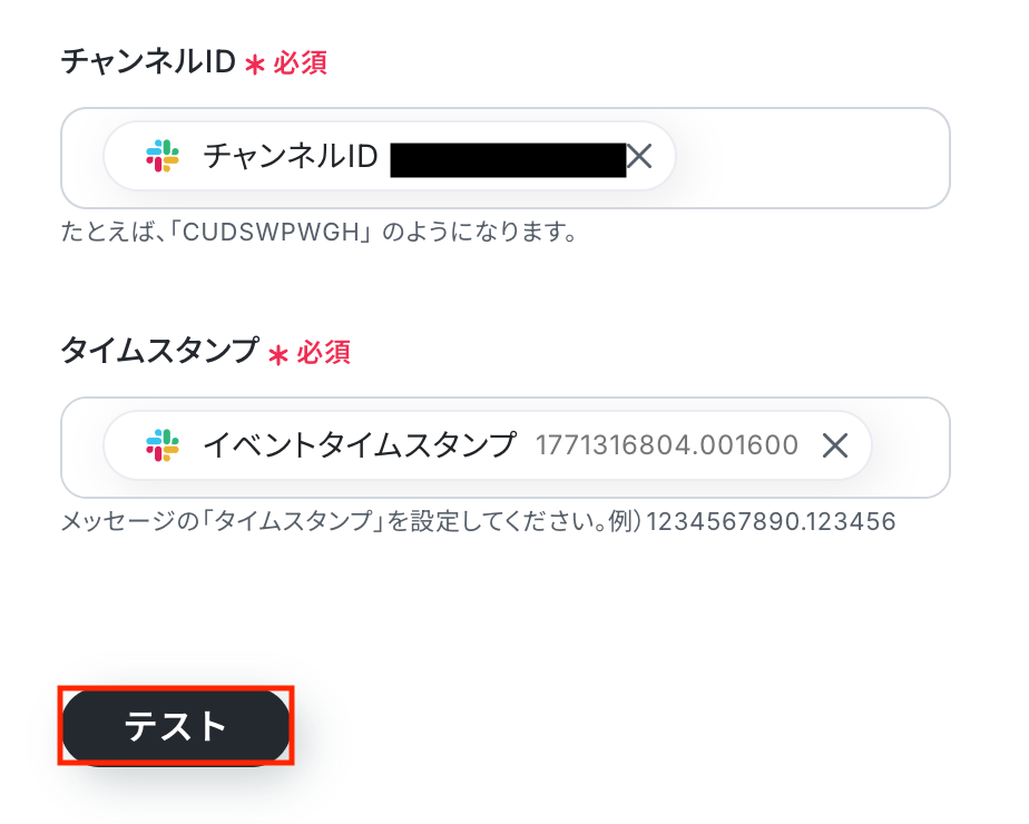 チャンネルID・タイムスタンプ 入力欄をクリックすると、前のステップでSlackから取得した値が表示されるので、選択して入力しましょう。 取得した値を活用することで値が固定化されず、フローボットを起動するたびに最新の情報を自動で反映できます。