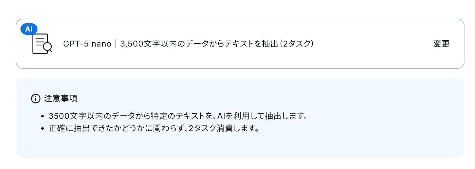 変換タイプは「GPT-4o mini|3,500文字以内のデータからテキストを抽出(2タスク)」がデフォルトで設定されているため、そのまま内容を確認してください。
