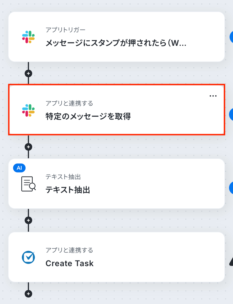 ステップ4:Slackで特定のメッセージを取得 続いて、トリガーのステップで取得した値を利用して、スタンプが押されたSlackのメッセージ内容を取得しましょう。 「特定のメッセージを取得」をクリックします。