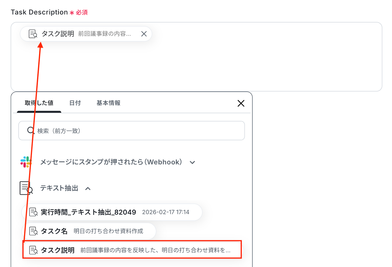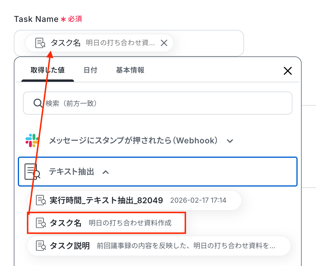 Task Name・Task Description 入力欄をクリックすると、前のステップでテキスト抽出した値が表示されるので、選択して入力しましょう。 なお、テキストを直接入力した部分は固定値とされるため、取得した値を活用せず設定を行うと毎回同じタスクがClio Manageに作成されてしまうので注意が必要です。