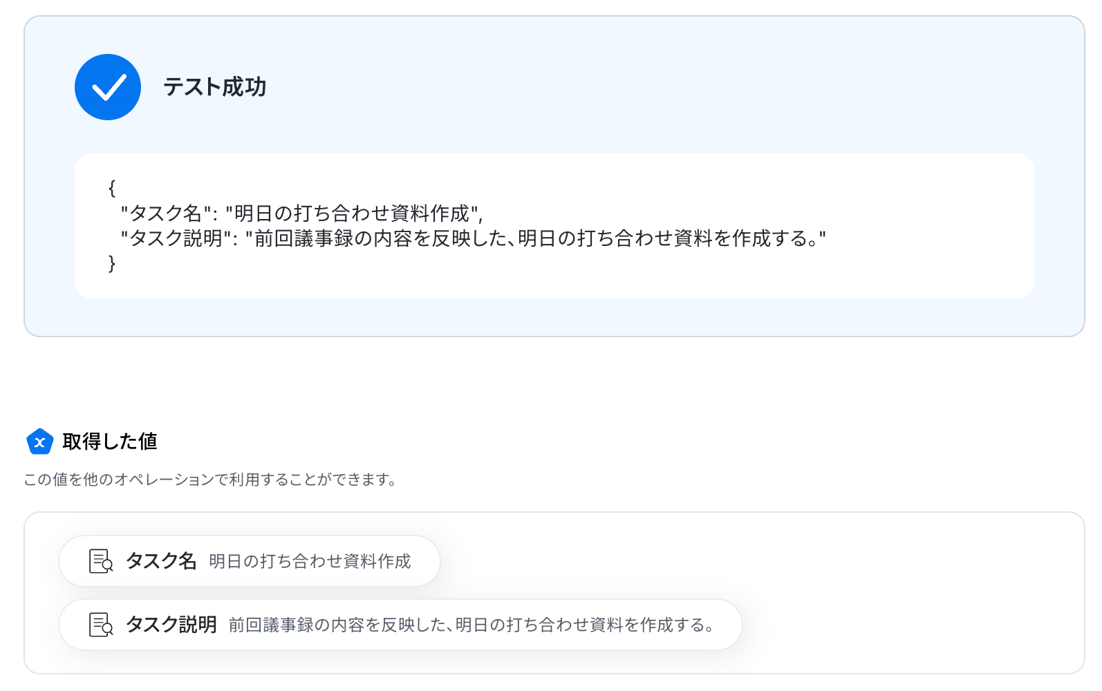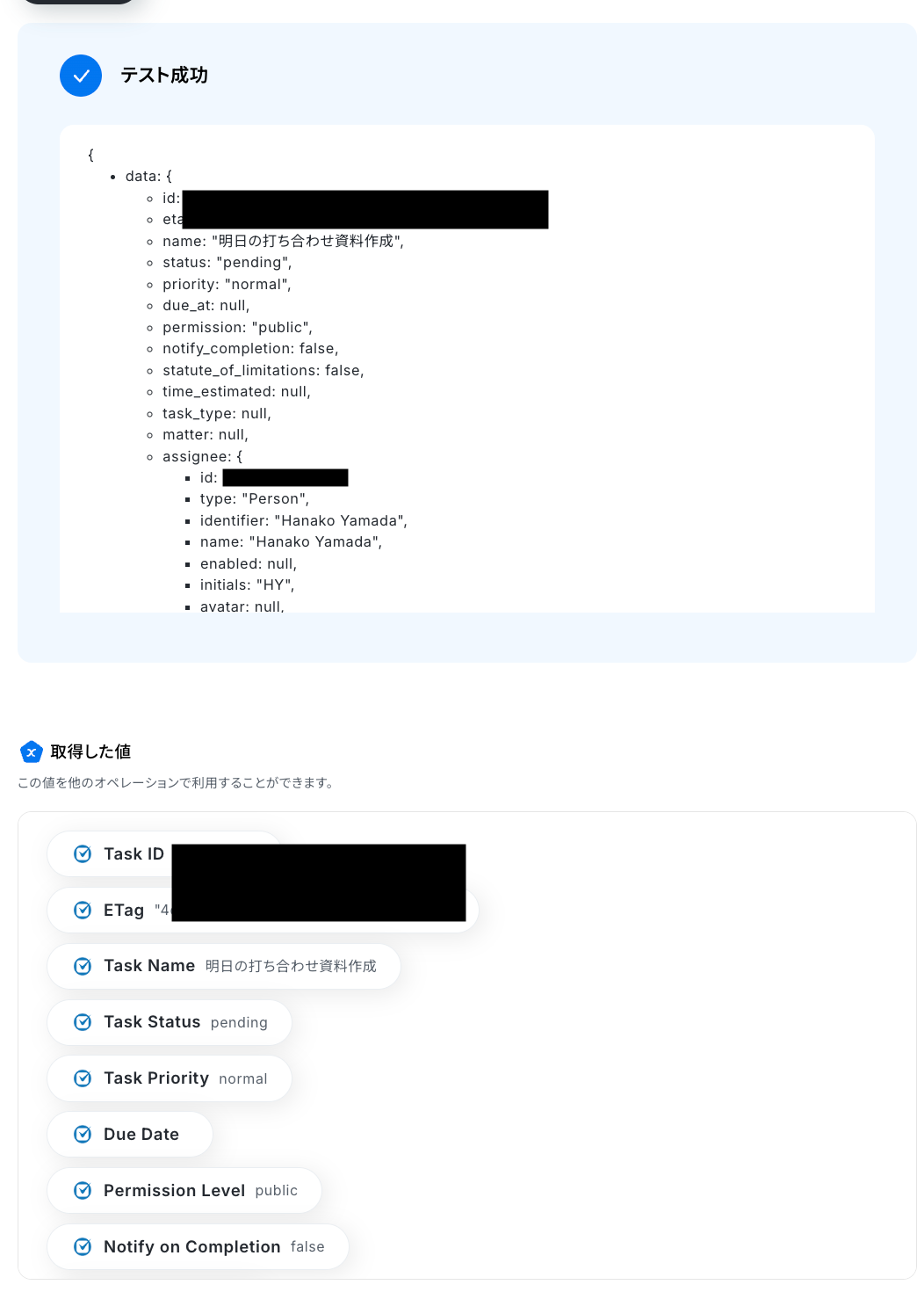 以下の画像の取得した値を利用し、この後のステップでClio Manageにタスクを作成できます。