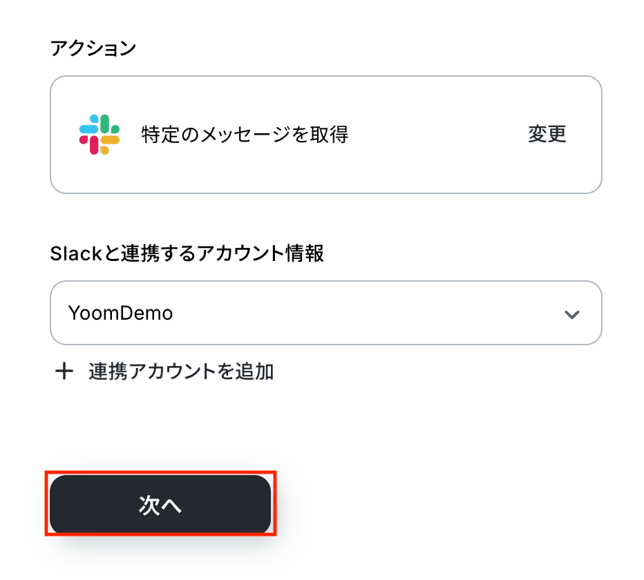 アクションはあらかじめ設定されているため、そのまま内容を確認してください。 Slackと連携するアカウント情報に問題がなければ、「次へ」をクリックします。