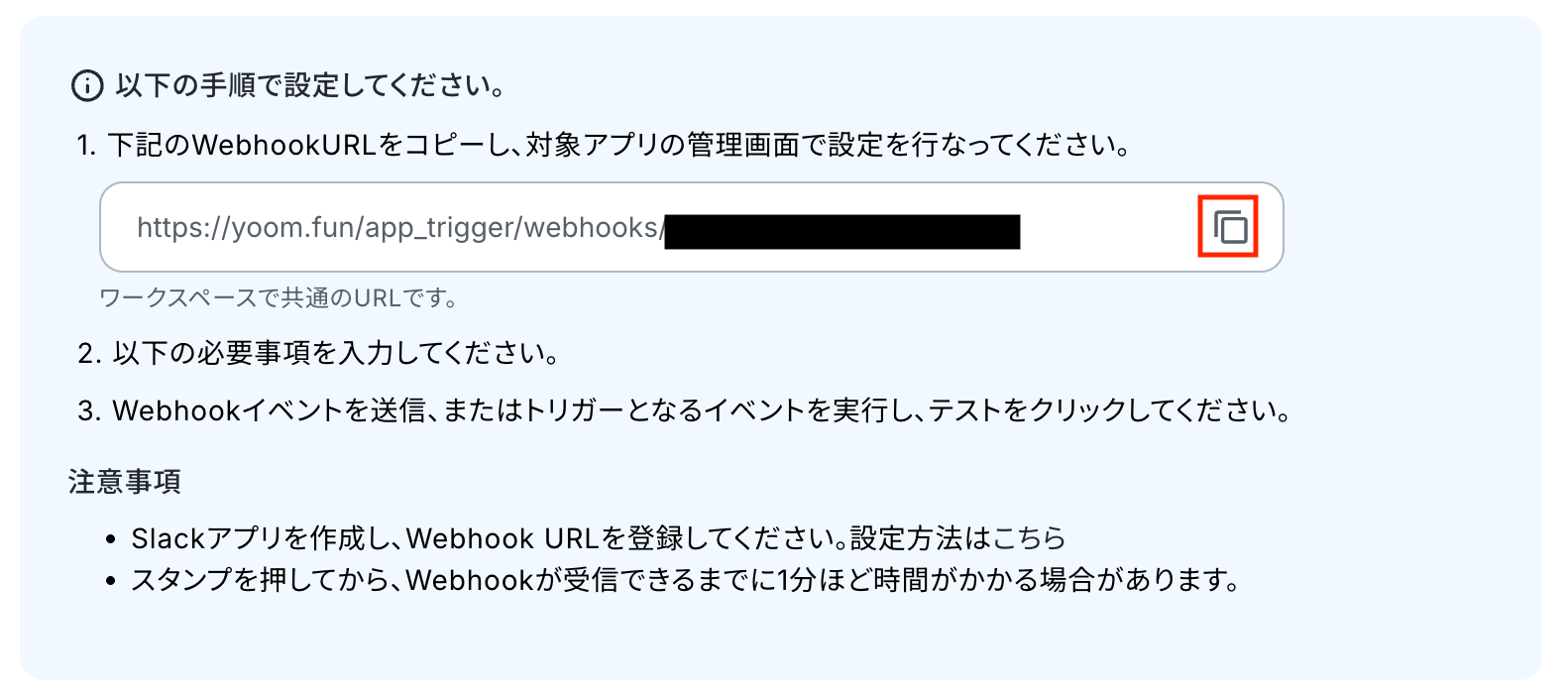 「WebhookURLを登録」をクリックして、YoomがSlackからWebhookを正しく受け取れるか確認しましょう。