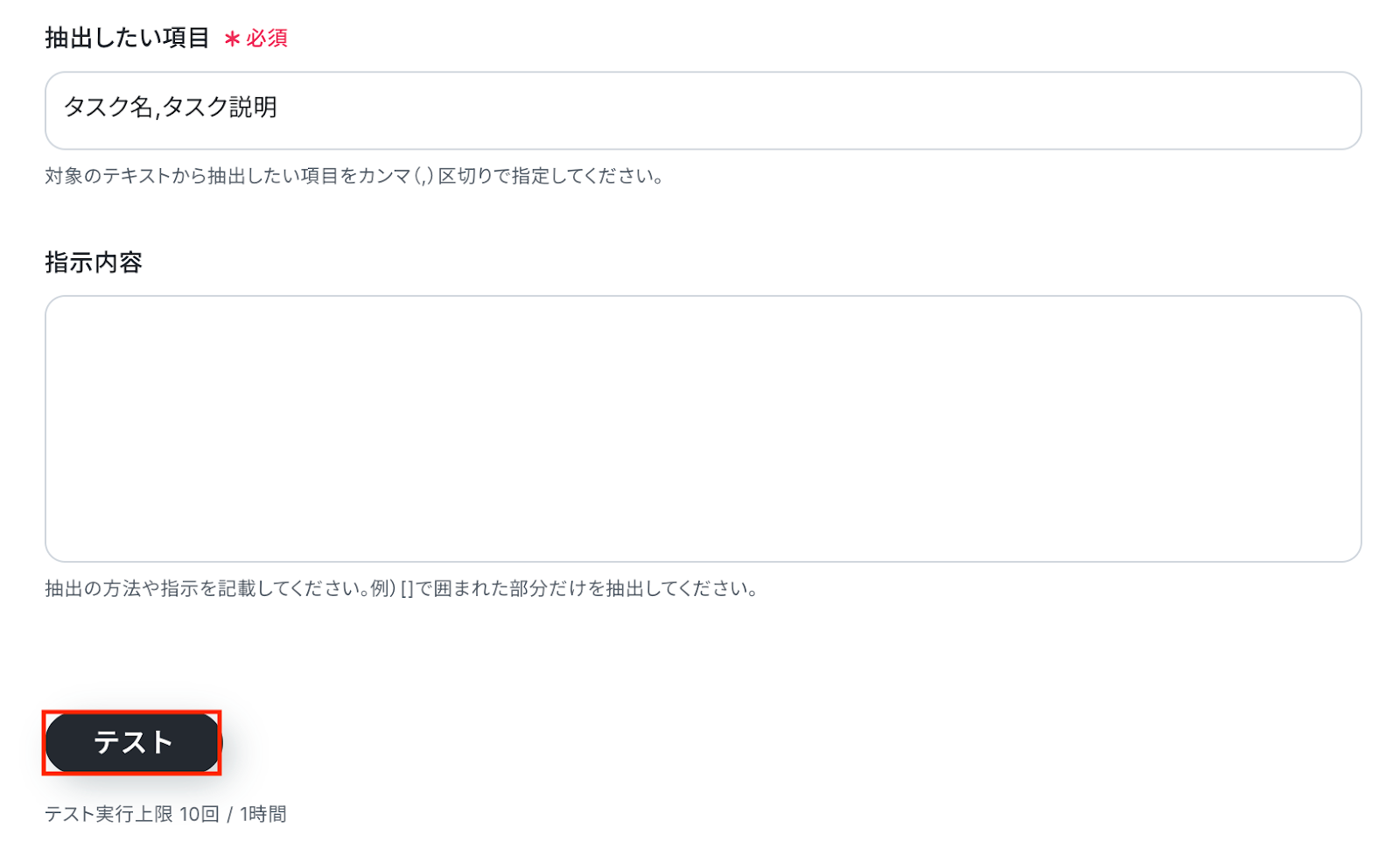 入力が完了したら、設定した項目が実際に正しく抽出されるかどうかを確認するため「テスト」をクリックしましょう。