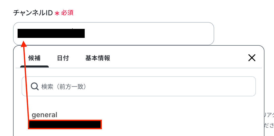 Yoomの操作画面に戻ります。チャンネルID 入力欄をクリックするとマイアプリ連携をしたアカウントから候補が表示されるので、対象の項目を選択しましょう。