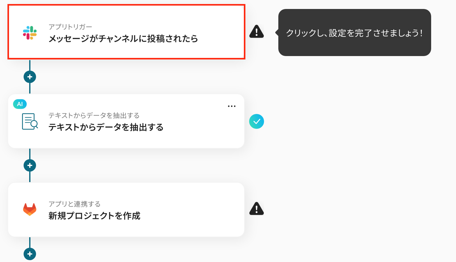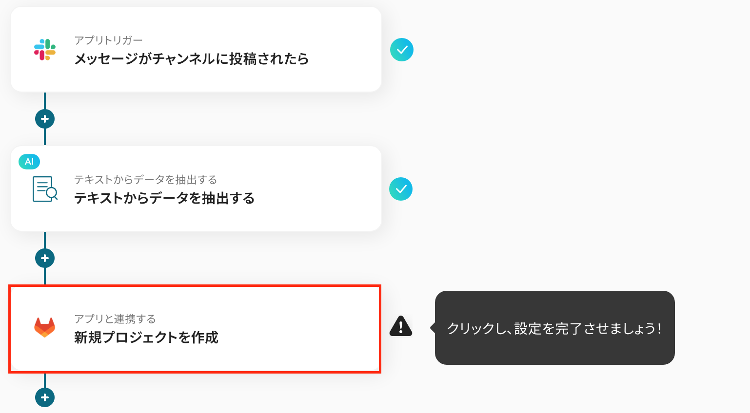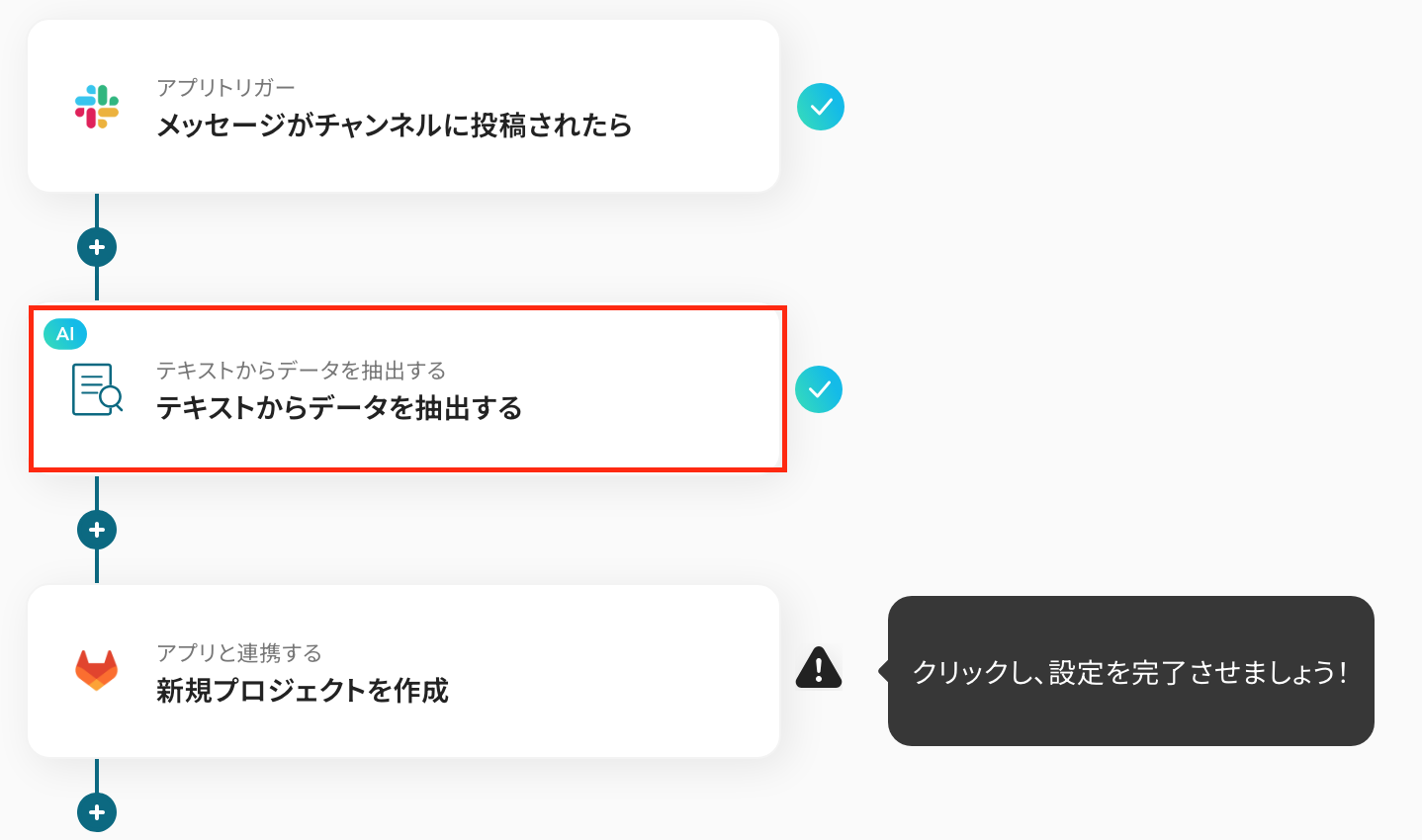AI機能でSlackのメッセージからデータを抽出する際に、プロジェクト名や概要など、抽出したい項目を任意で設定してください GitLabでプロジェクトを作成するアクションでは、プロジェクト名や詳細説明に、前段のAI機能で抽出した内容を埋め込んだり、固定のテキストを追加したりといったカスタムが可能です ■注意事項