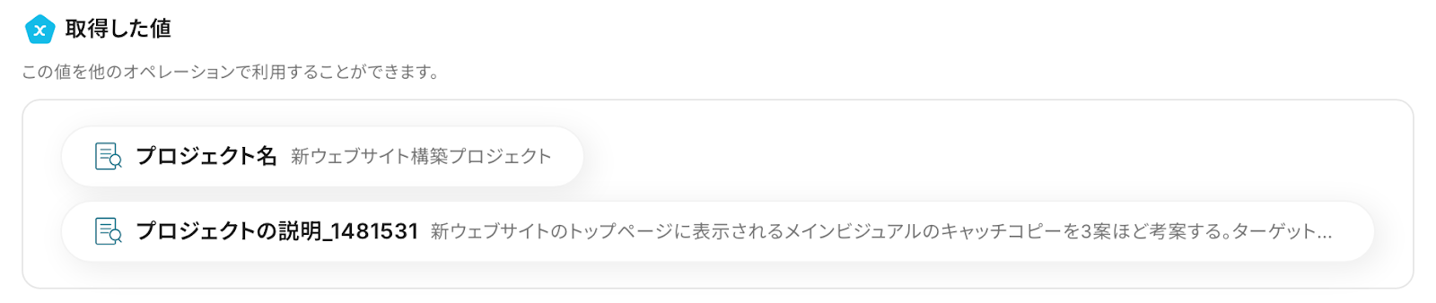 「プロジェクトの説明」 :入力欄をクリックして表示されるアウトプットを引用して設定します。