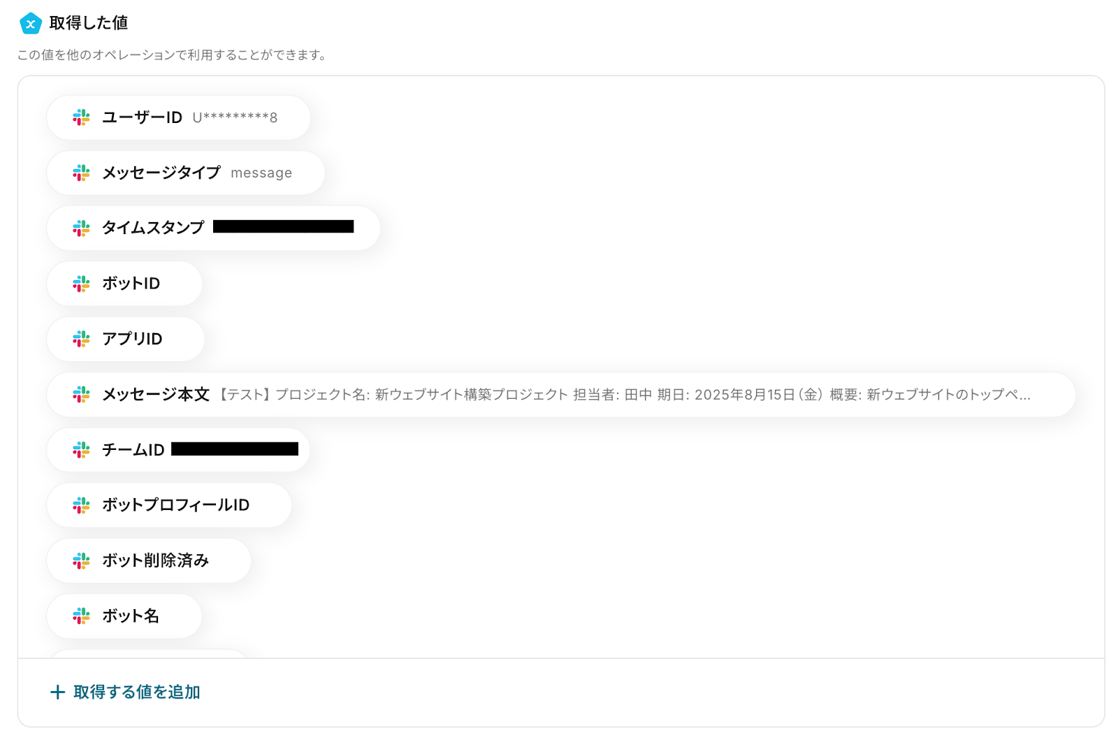 テストをする前に、Slackにメッセージを投稿します。投稿後、Yoomの画面に戻って「テスト」を押してください。 テストに成功すると、Slackから取得した内容が取得した値 に表示されます。
