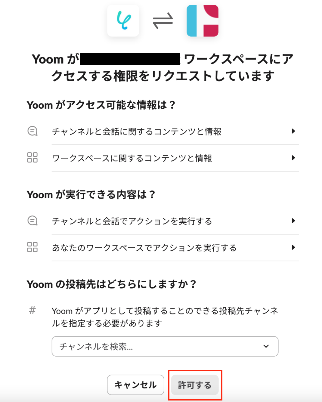投稿先を選択して、「許可する」をクリックしてください。 これで、Slackのマイアプリ連携は完了です!