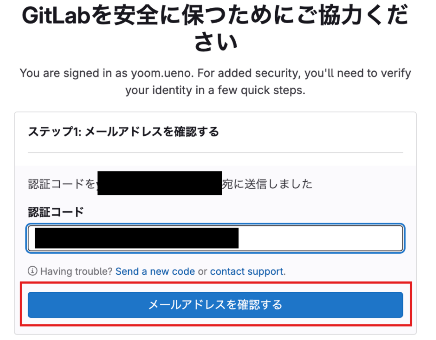 認証コードを入力し、「メールアドレスを確認する」をクリックします。