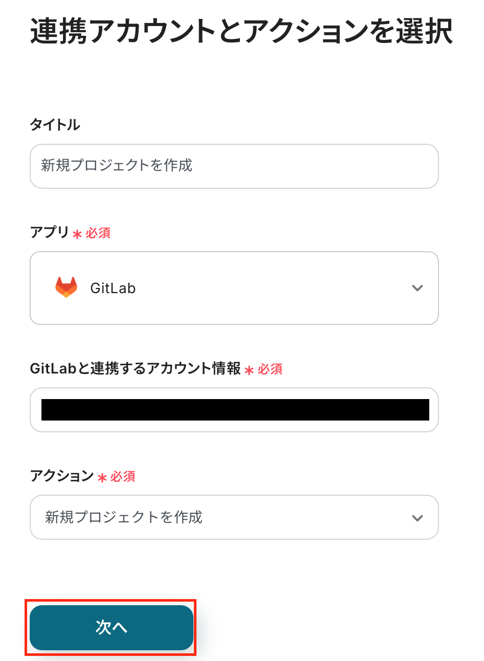 GitLabで「新規プロジェクトを作成」アクションを設定する際、プロジェクト名、説明、公開範囲などの各項目に、Googleフォームの回答内容(アウトプット)を動的に割り当てることができます。例えば、フォームの「プロジェクト名」の回答をGitLabのプロジェクト名に設定したり、特定の回答をプロジェクトの説明文に含めたりするなど、柔軟なカスタマイズが可能です。 ■注意事項