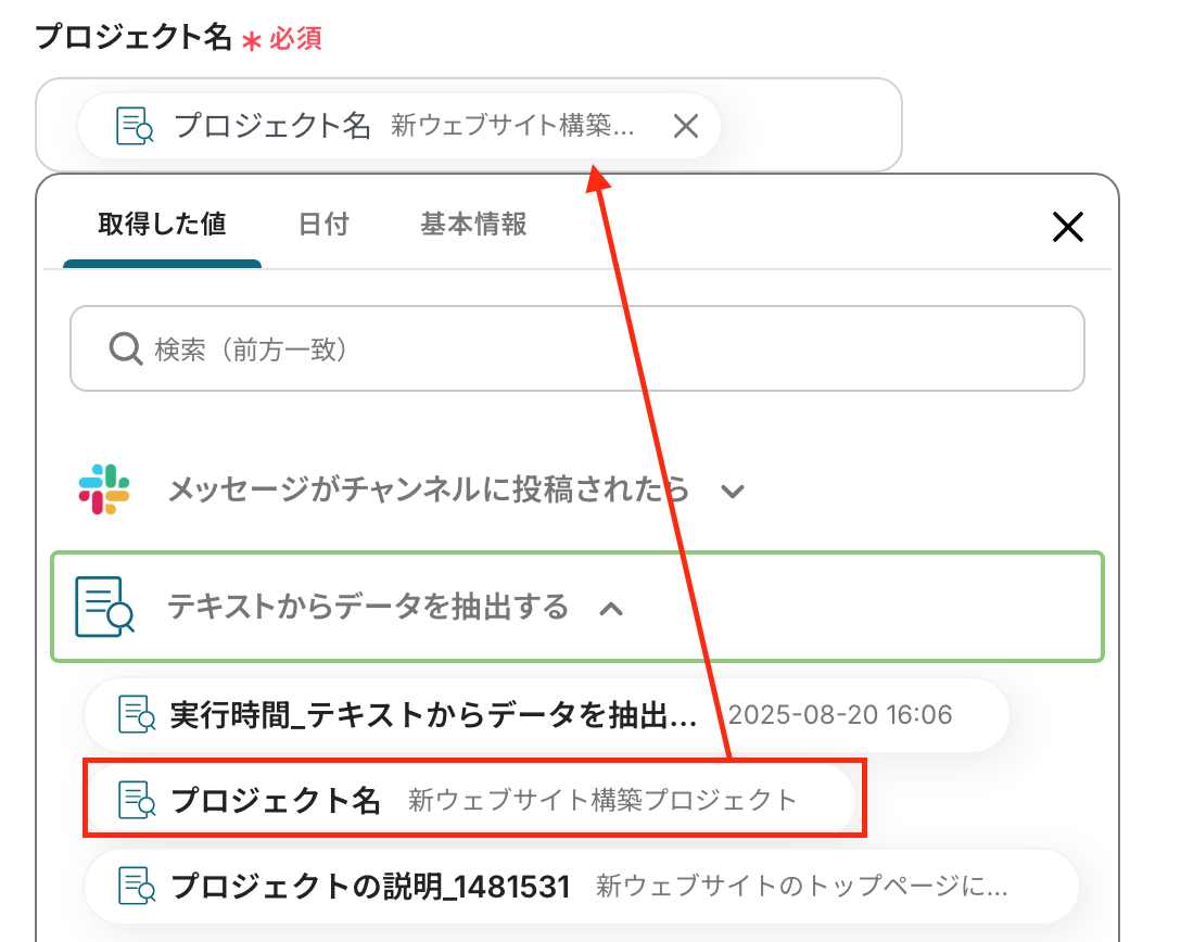 「プロジェクト名」 :入力欄をクリックして表示されるアウトプットから選択してください。