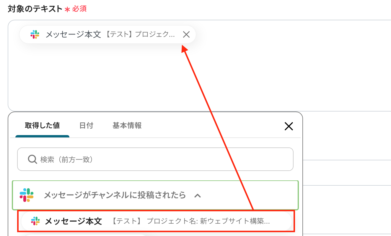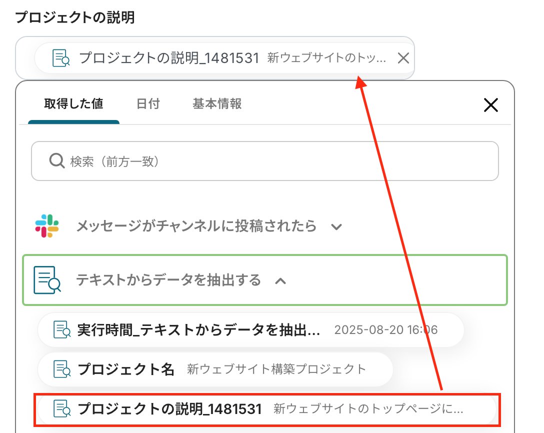 「対象のテキスト」 :データを抽出したいテキストを設定します。入力欄をクリックするとアウトプットが表示されるので、引用して設定してください。