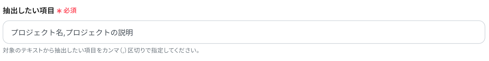 「抽出したい項目」 :対象のテキストから抽出したい項目をカンマで区切り、設定してください。