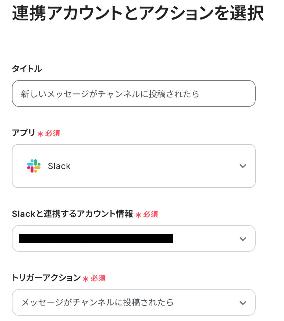 「トリガーアクション」:「メッセージがチャンネルに投稿されたら」を選択