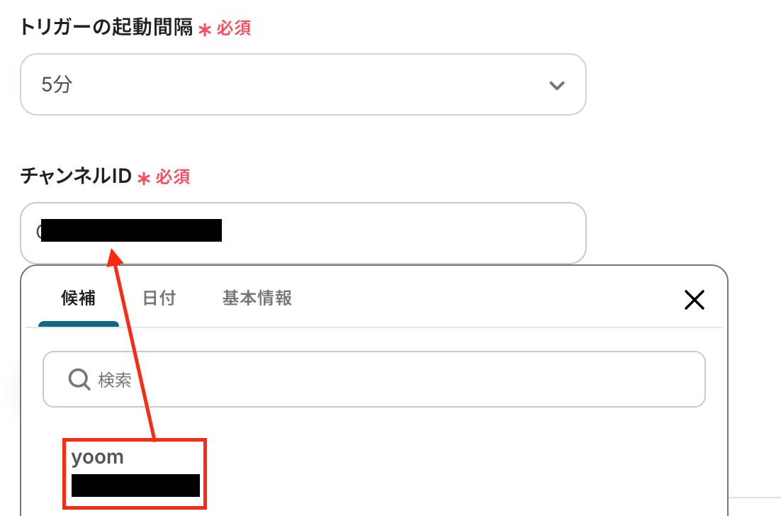 「チャンネルID」 :入力欄をクリックして表示される「候補」から選択します。