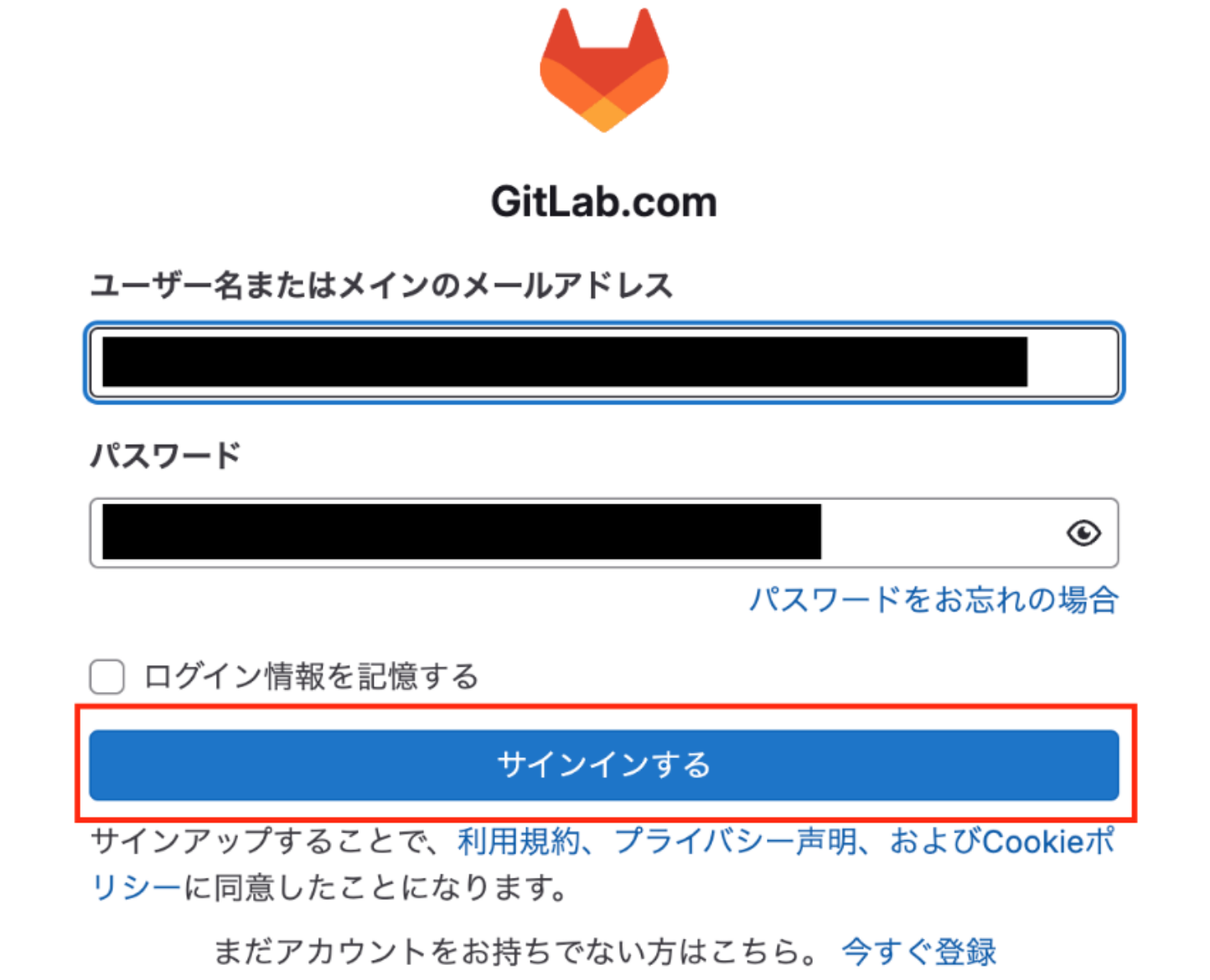 GitLabを選択すると下記の画面が表示されます。 連携させたいGitLabの「ユーザー名またはメインのメールアドレス」と「パスワード」を入力し、「サインインする」をクリックしましょう。