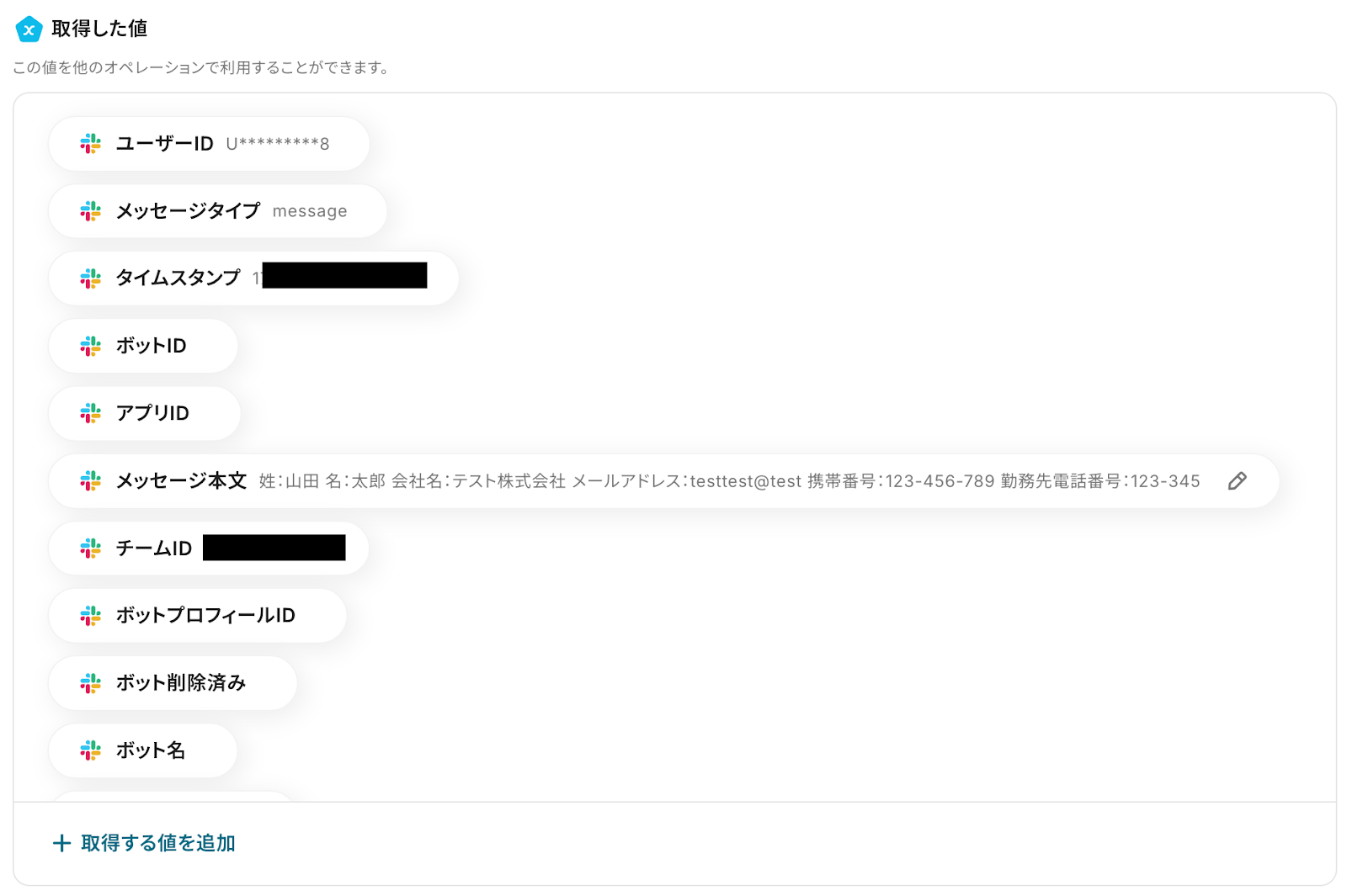 テストに成功すると、Slackから取得した内容が取得した値(アウトプット)に表示されます。