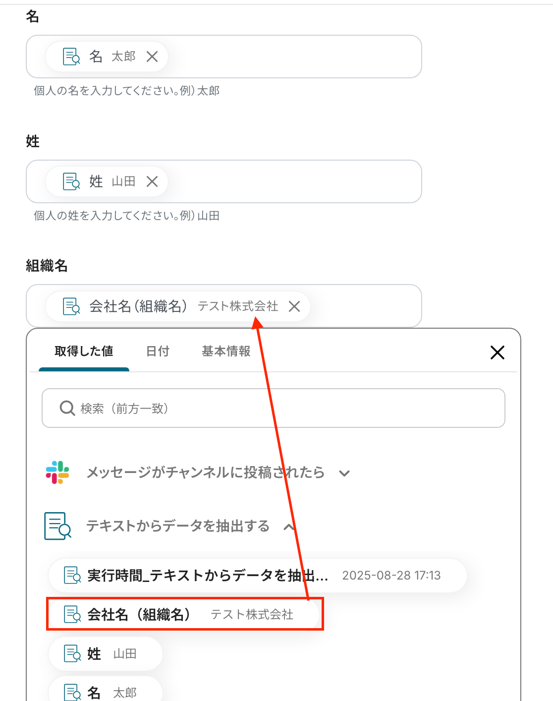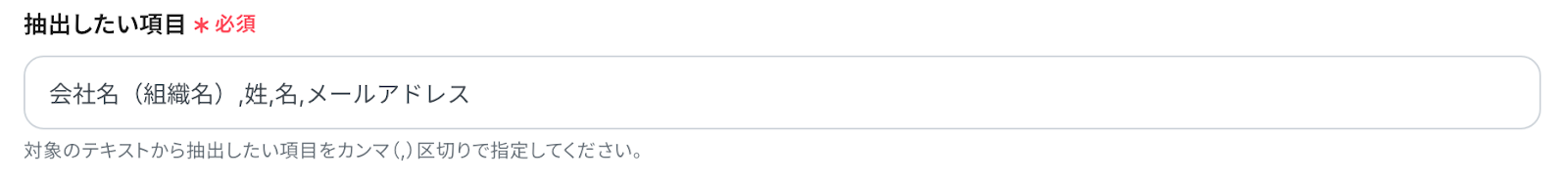 「抽出したい項目」:対象のテキストから抽出したい項目をカンマで区切り、設定してください。