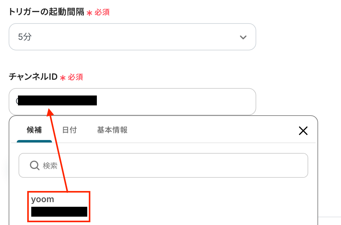 「チャンネルID」:入力欄をクリックして表示される「候補」から選択します。