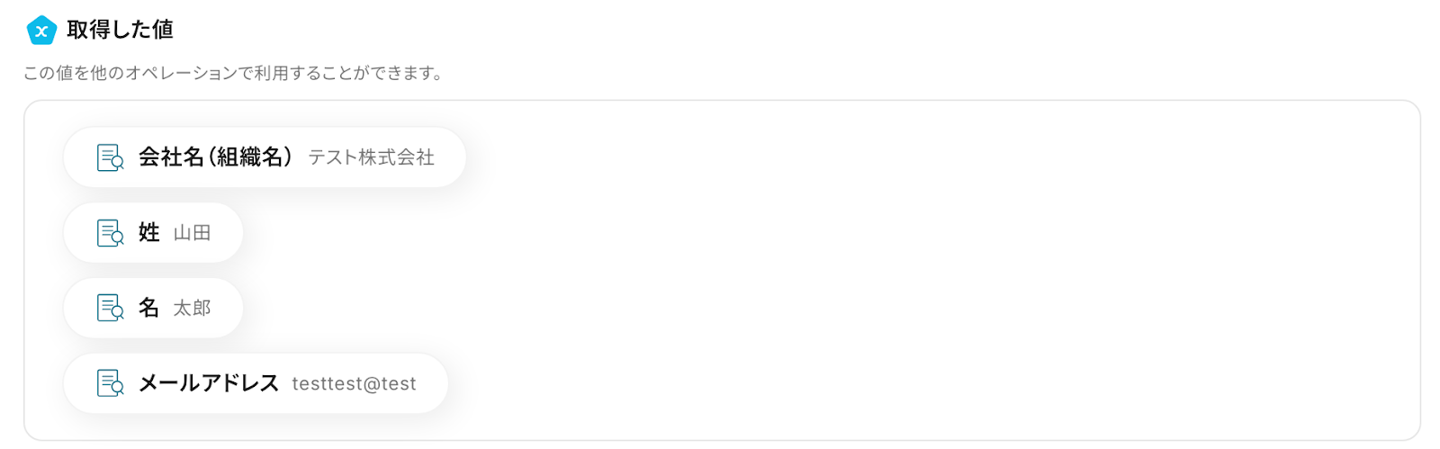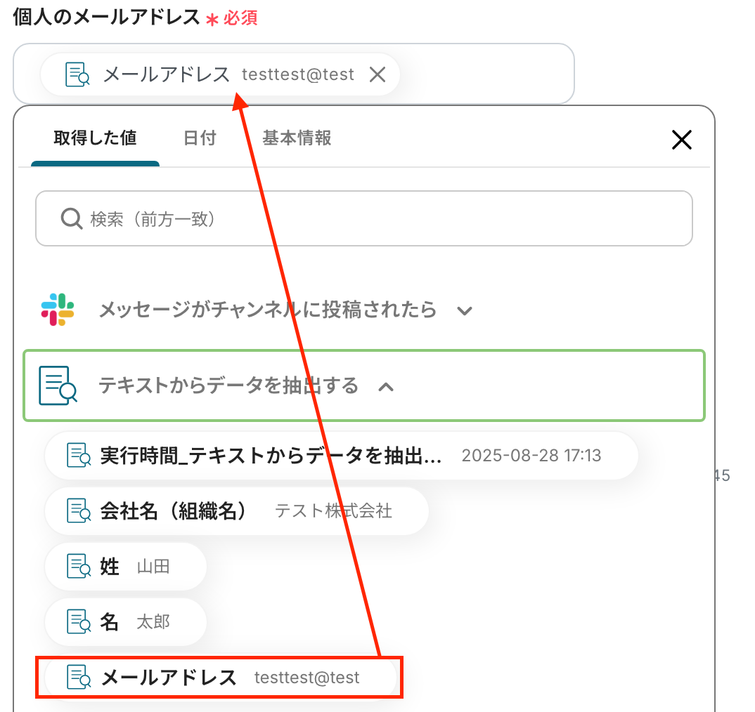 「個人のメールアドレス」は、入力欄をクリックして表示されるアウトプット(取得した値)から選択してください。