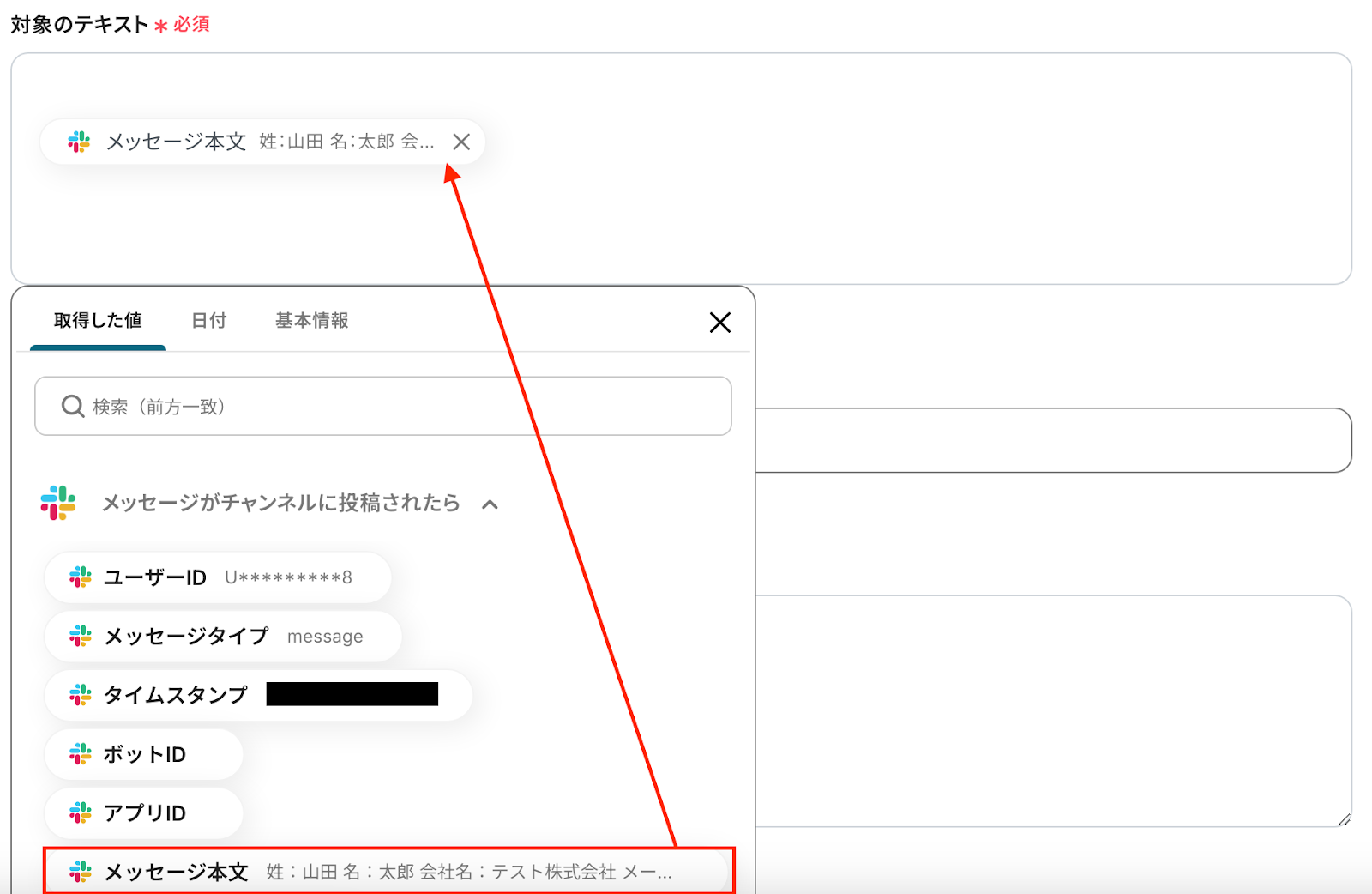 「対象のテキスト」:データを抽出したいテキストを設定します。入力欄をクリックするとアウトプットが表示されるので、メッセージ本文を設定してください。